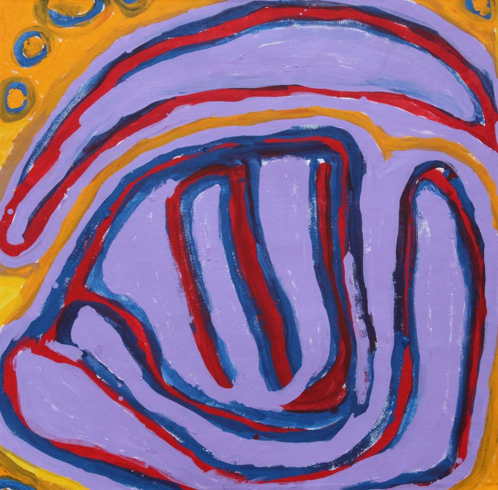 Portrayed in this work are features of Nungabar’s family’s ngurra, such as the striking salt lakes, permanent red tali (sandhills), warta (trees, vegetation), and the individually named water sources they camped at. Rock holes, waterholes, soaks and springs were all extremely important sites for Martu people during the pujiman period, and are generally depicted with circular forms.