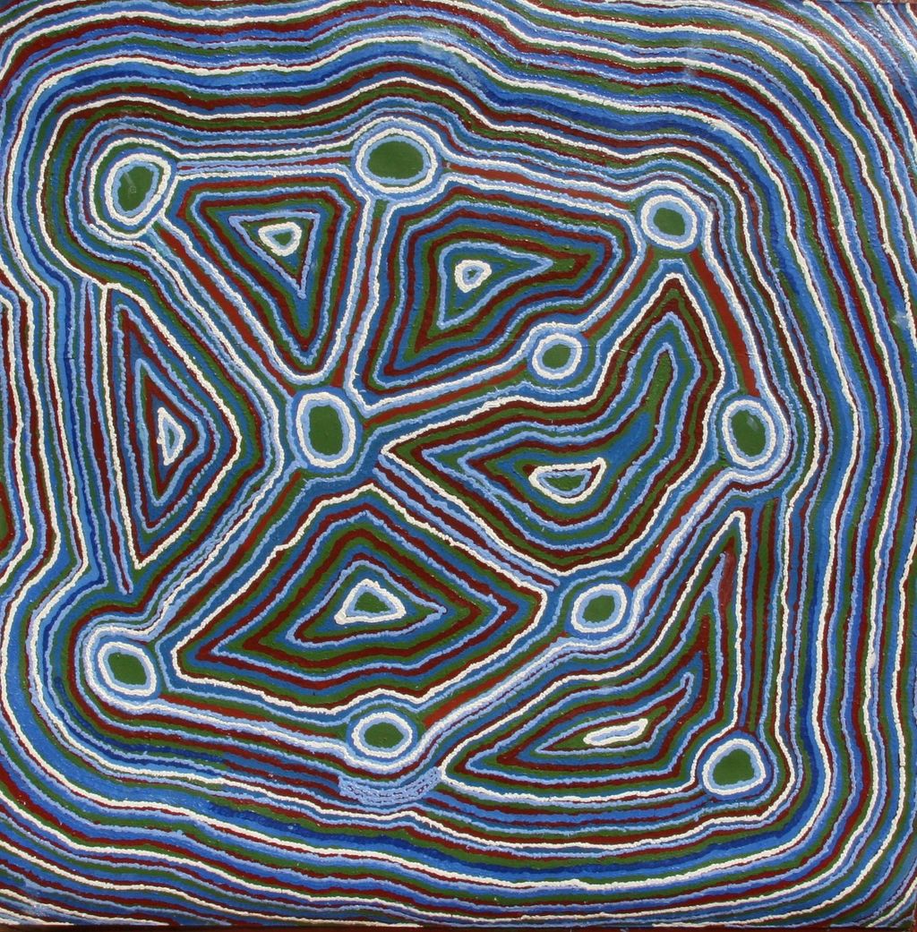 This is Kumpaya’s Country- her ‘ngurra’ (home Country, camp). People identify with their ngurra in terms of specific rights and responsibilities, and the possession of intimate knowledge of the physical and cultural properties of one’s Country. Painting ngurra, and in so doing sharing the Jukurrpa (Dreaming) stories and physical characteristics of that place, has today become an important means of cultural maintenance.