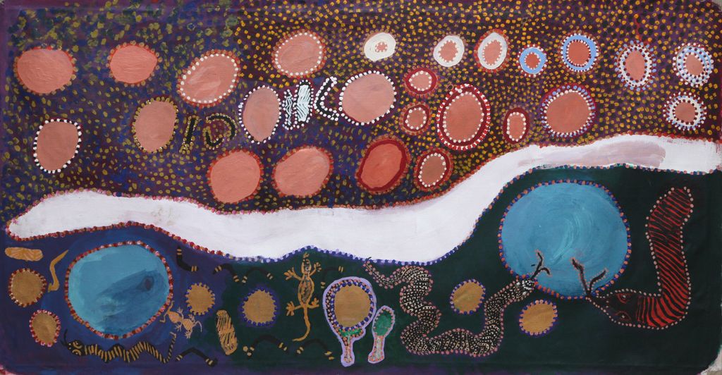 This painting depicts Puntawarri, in the artists’ family’s country. Puntawarri is on the middle stretches of the Canning Stock Route, near Well 17 also known as Durba Springs. Puntawarri is an important cultural area, east of the Jigalong Aboriginal Community, where the artist now lives with his family. The artist frequently travelled and hunted with his family in this area during pujiman (bush) days.