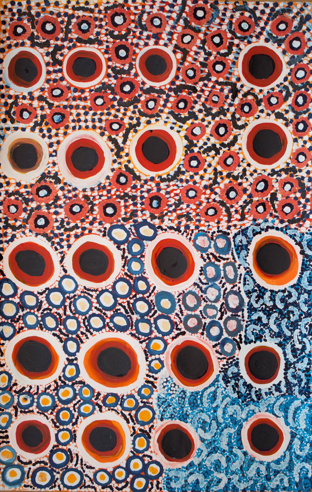 This painting depicts a part of the Minyi Puru (Seven Sisters) story. Minyi Puru is an important Jukurrpa (dreamtime) story about seven sisters that are travelling throughout the desert running away from an old man called Yurla. The man chases the wantis (women) all the way from Roebourne on the west coast right through Martu country before flying east. Along the way they stop at a lot of important places to camp, sing, dance and collect bush tucker. There are also many interactions with Yurla when he catches up with them along the way, creating an amazing abundance of stories and meaning with this culturally rich narrative.