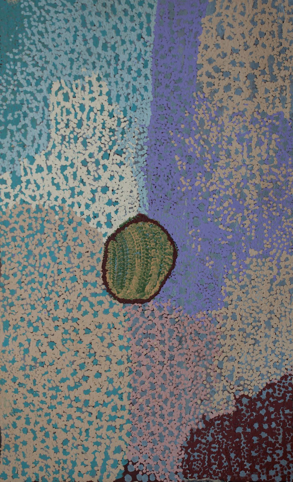 This painting depicts the artist’s Country, where she and her sisters and fellow artists May Wokka Chapman and Nyanjilpayi Nancy Chapman lived and camped as children. Mulyatingki and her family walked extensively through this area with their extended family during pujiman (traditional, desert-dwelling) times.