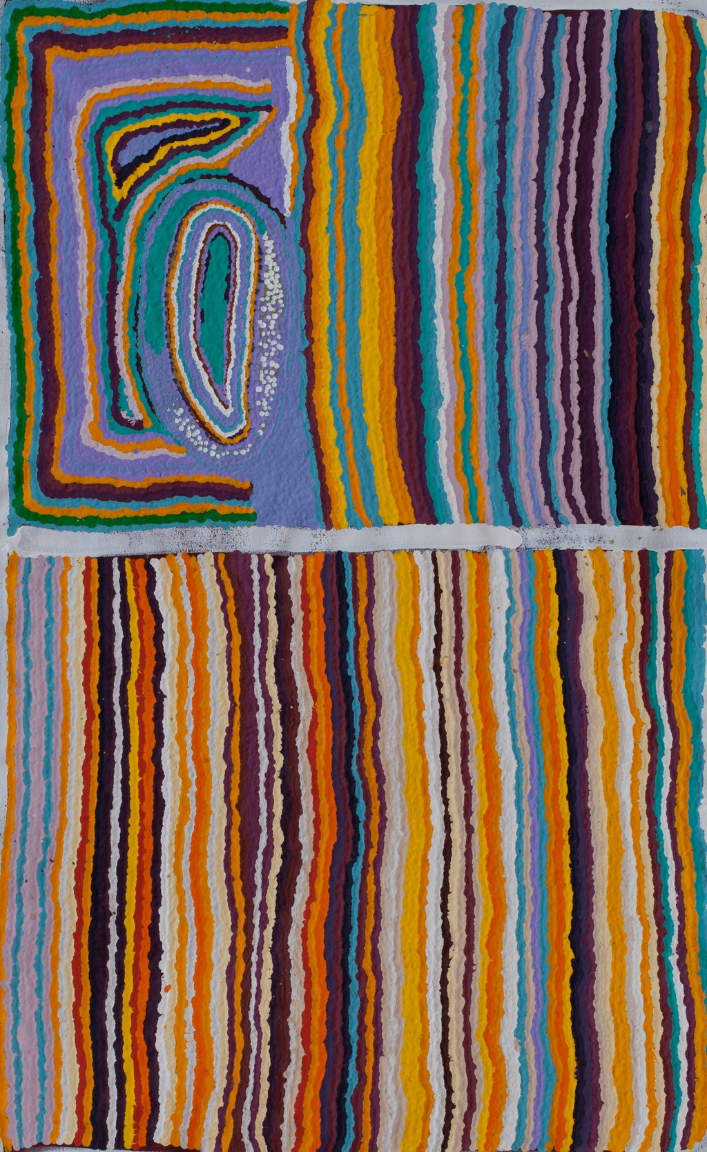 This painting portrays physical elements of Martu Country, such as the dominant tali (sandhills), warta (trees, vegetation), and water sources. Rock holes, waterholes, soaks and springs were all extremely important sites for Martu people during the pujiman era, with many important jukurrpa (dreamtime stories) chronicling the creation of these landmarks. In the past the Martu lived nomadically, moving from water source to water source, and hunting and gathering bush tucker as they went. They would traverse very large distances annually, visiting specific areas in the dry and wet season depending on the availability of water. As they travelled and hunted they would also burn areas of country creating a larger diversity of plant and animal life.