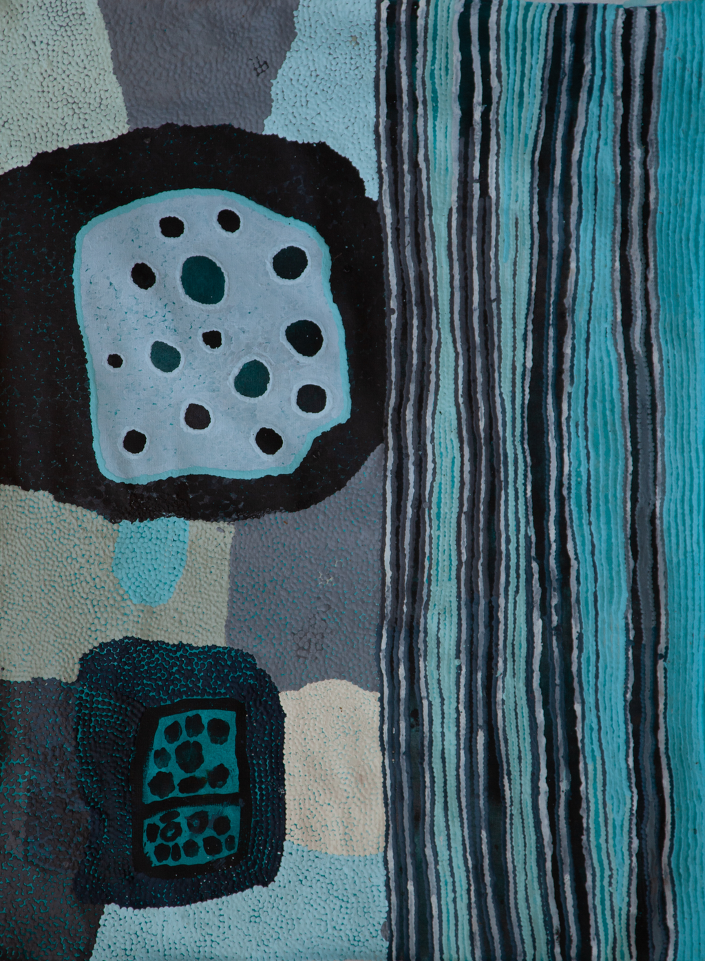 This painting depicts a number of significant sites yinta (waterholes), rockhols and claypans.
