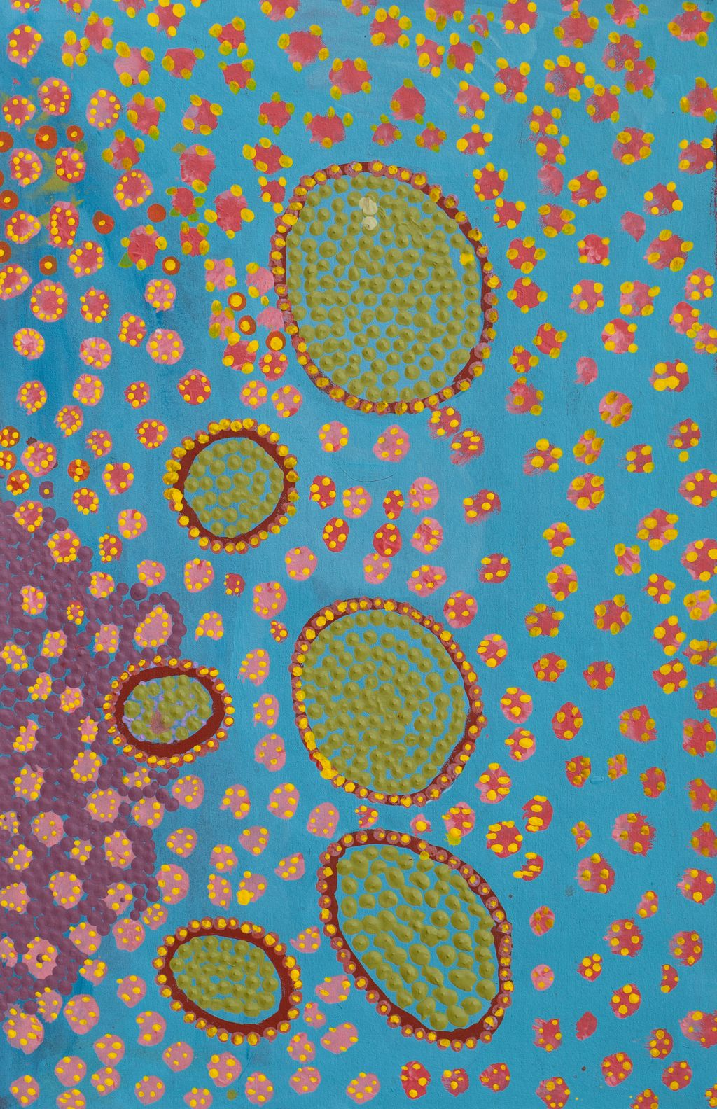 This is Yunkurra’s Country- his ‘ngurra’ (home Country, camp). People identify with their ngurra in terms of specific rights and responsibilities, and the possession of intimate knowledge of the physical and cultural properties of one’s Country. Painting ngurra, and in so doing sharing the Jukurrpa (Dreaming) stories and physical characteristics of that place, has today become an important means of cultural maintenance.