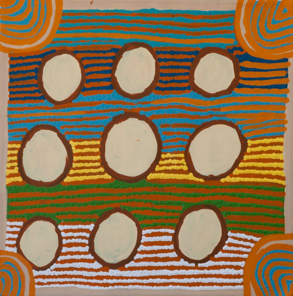 This work portrays an area of Country that can be interpreted in multiple ways. Firstly, the image may be read as an aerial representation of a particular location known to the artist- either land that they or their family travelled, from the pujiman (traditional, desert dwelling) era to now. During the pujiman period, Martu would traverse very large distances annually in small family groups, moving seasonally from water source to water source, and hunting and gathering bush tucker as they went. At this time, one’s survival depended on their intimate knowledge of the location of resources; thus physical elements of Country, such as sources of kapi (water), tali (sandhills), different varieties of warta (trees, vegetation), ngarrini (camps), and jina (tracks) are typically recorded with the use of a use of a system of iconographic forms universally shared across the desert.