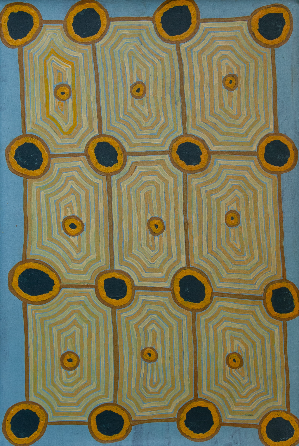 As Pauline states in her account, this work depicts the waterholes and tali (sandhills) in the area surrounding Kunawarritji, typically represented with circular forms. During the pujiman period, knowledge of water sources was critical for survival, and today Martu Country is still defined in terms of the location and type of water. Each of the hundreds of claypans, rockholes, waterholes, soaks and springs found in the Martu desert homelands is known through real life experience and the recounting of Jukurrpa narratives by name, location, quality and seasonal availability.