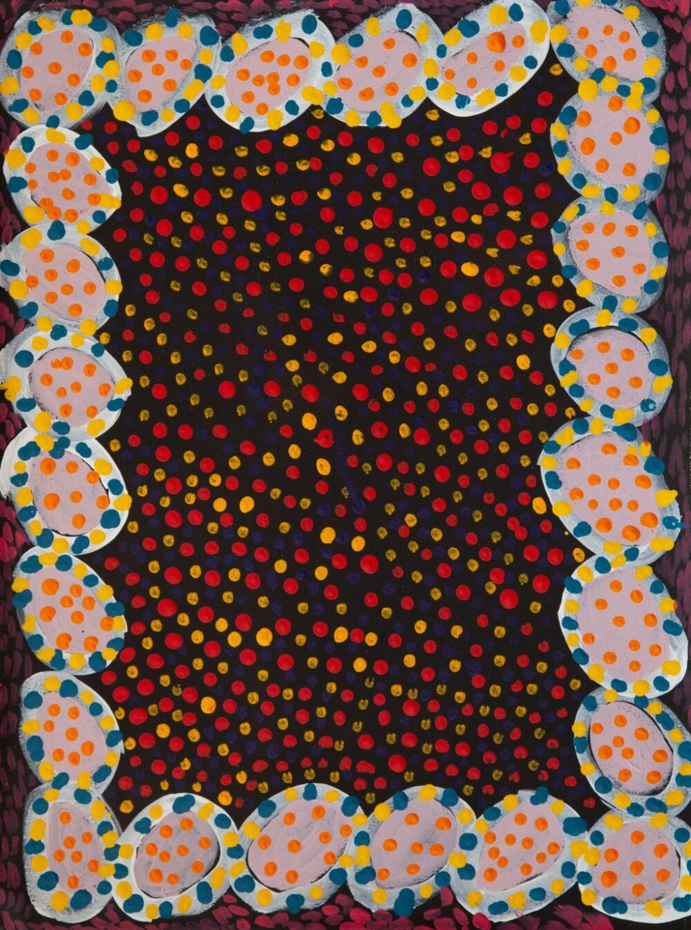 Parnngurr rockhole is located just south of Parnngurr Aboriginal community. At the junction of three linguistic groups; Manyjilyjarra, Kartujarra, and Warnman, it was a critical and permanent source of water during the pujiman (traditional, desert born) era that supported many ritual large gatherings. During this nomadic period families stopped and camped here depending on the seasonal availability of water and the corresponding cycles of plant and animal life on which hunting and gathering bush tucker was reliant. At Parnngurr and other similarly important camp sites families would meet for a time before moving to their next destination. Parnngurr and its surrounds are physically dominated by distinctively red tali (sandhills), covered sparingly with spinifex and low lying shrub. Parnngurr forms part of Betty’s ngurra (home Country, camp) through her parents and through renowned fellow Martumili Artist and aunt Bugai Whyoulter.