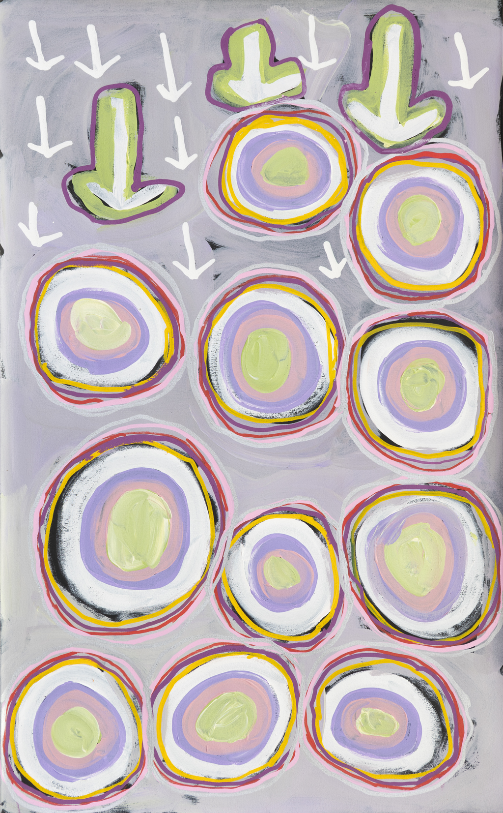 Puntawarri lies within Judith’s ngurra (home Country, camp) through her mother’s family, and as a young girl she frequently travelled and hunted with her family in this area, learning the stories for this Country. Depicted in this work are the tracks of a group of emus on their way to Puntawarri waterhole, searching for kapi (water).