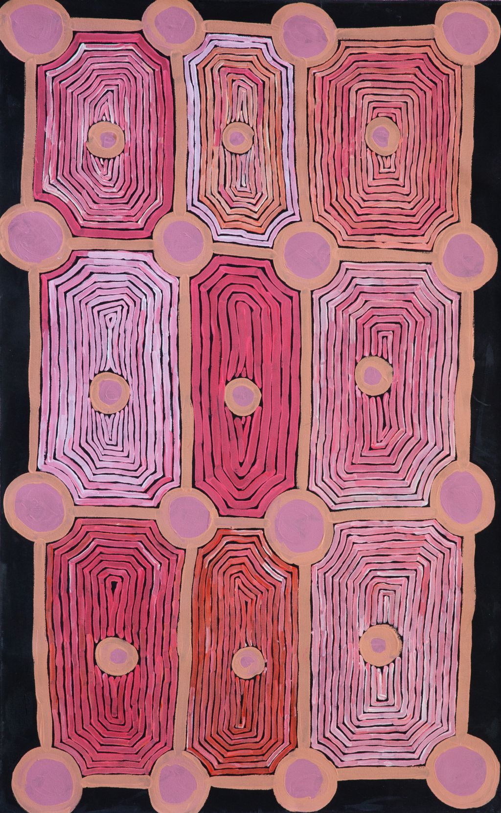 “These are the rockholes around Kunawarritji (Canning Stock Route Well 33). My mum [Jugarda Dulcie Gibbs] painted the same. It’s my father’s Country; he was born at Well 33. I’m painting Well 35, Kinyu, all the way to Well 38, Wajaparni. This is a big place for us. It’s important. I went on a trip with Kanyirninpa Jukurrpa [ranger group] last year [2018] to visit all these rockholes.”