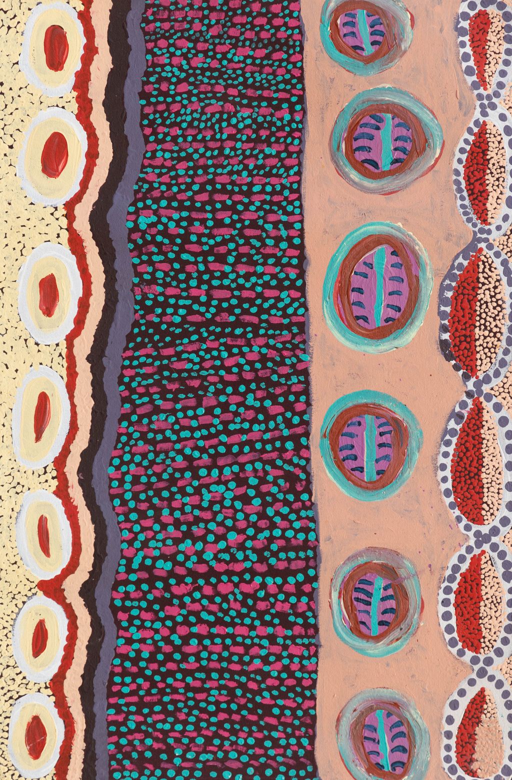 “When Martu paint, it’s like a map. Martu draw story on the ground and on the canvas, and all the circle and line there are the hunting areas and different waters and tracks where people used to walk, and [some you] can’t cross, like boundaries. So nowadays you see a colourful painting and wonder what it is, but that’s how Martu tell story long ago. It’s not just a lovely painting, it’s a story and a songline and a history and everything that goes with it.”