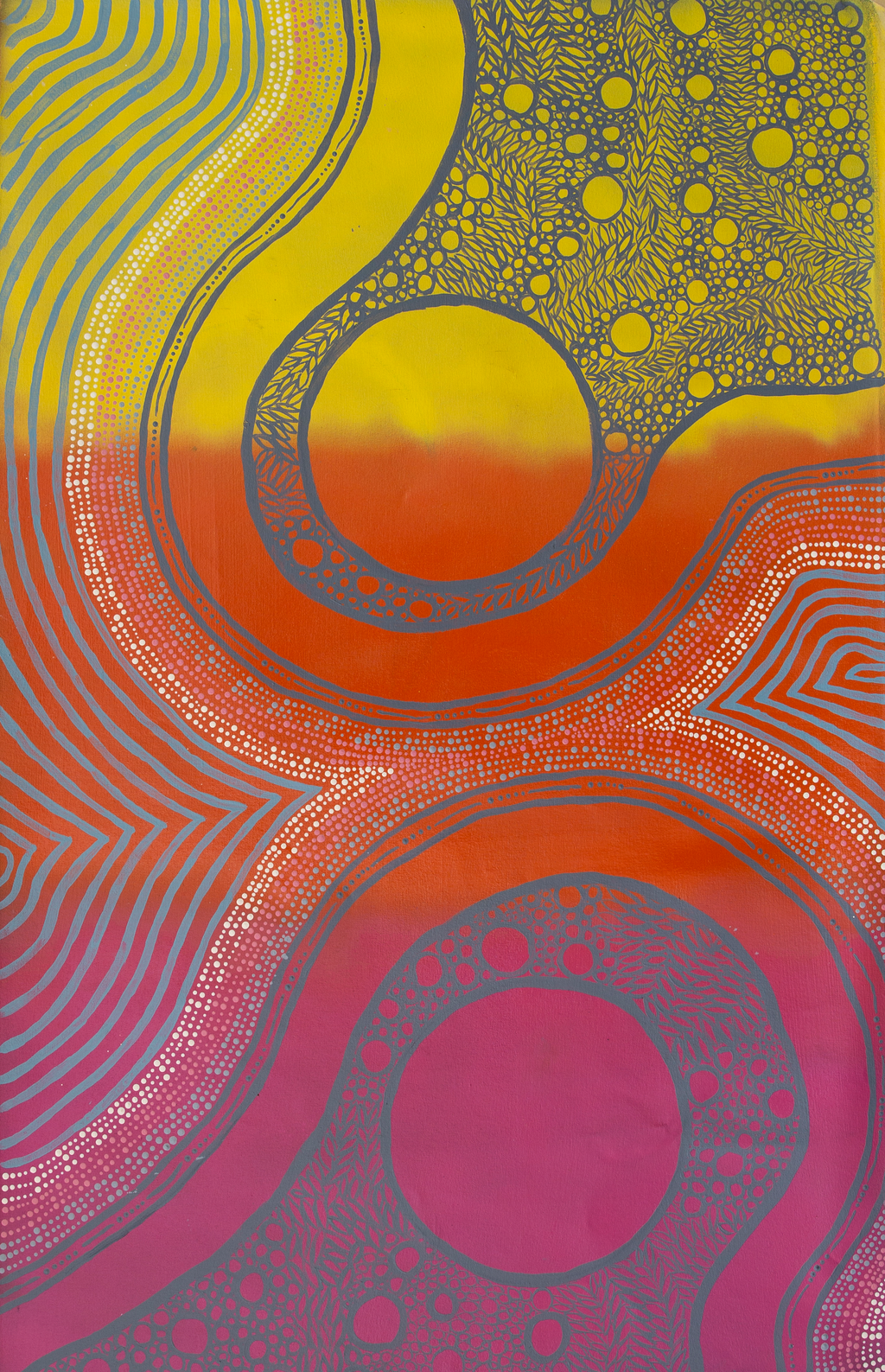 “This painting is a bird’s eye view of the reflection of the sunset on the beach and reef of Enjadine Point, Bidyadanga.”