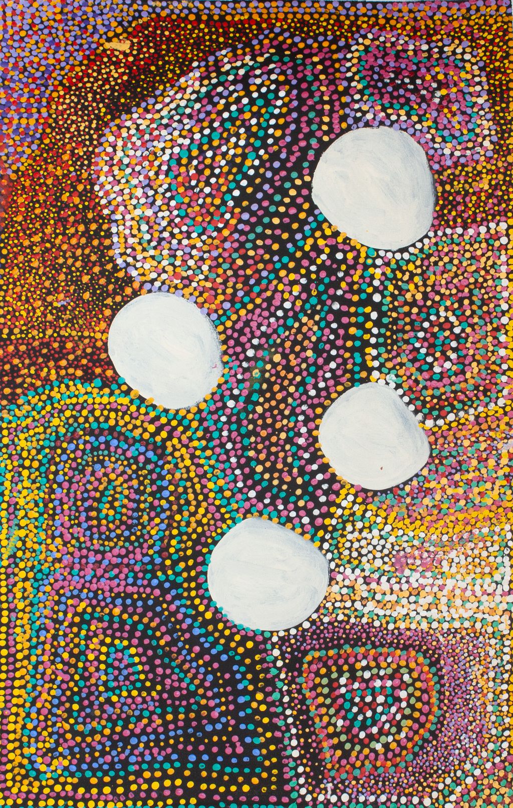 Younger Martu artists often start painting alongside their parents, grandparents, and extended family, which fosters an organic learning process. This not only involves mastering painting techniques but also understanding specific locations, family histories, traditional ways of life, bush tucker, and Jukurrpa (Dreaming). Over time, with encouragement from their peers, they develop their own distinct styles and explore unique painting techniques and subject matter. In this work the artist brings a contemporary, evolving perspective to their work.