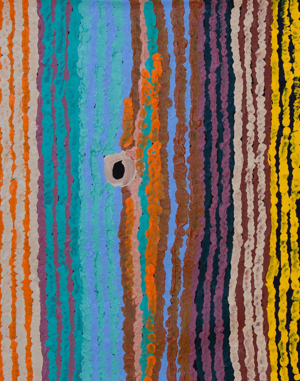 This work depicts a waterhole in the area around Moolyella, an area close to Marble Bar that was mined for tin from 1898. Industrial production ceased by 1921, and from the late 1920’s several Aboriginals families, including Lorna’s, began working the mine. Tin and other minerals were retrieved from claypans and dry river beds using a yandy (dish used for winnowing seed).