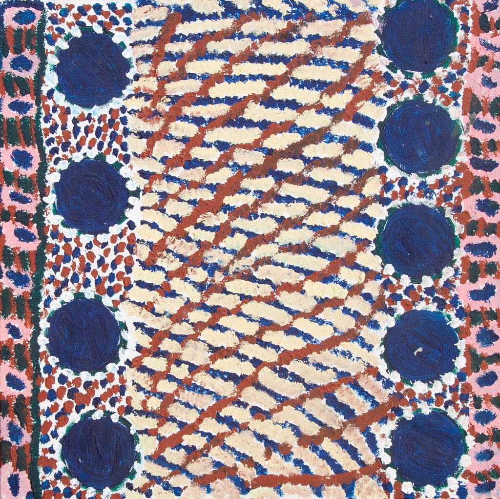 This work portrays an area of Country that can be interpreted in multiple ways. Firstly, the image may be read as an aerial representation of a particular location known to the artist- either land that they or their family travelled, from the pujiman (traditional, desert dwelling) era to now. During the pujiman period, Martu would traverse very large distances annually in small family groups, moving seasonally from water source to water source, and hunting and gathering bush tucker as they went. At this time, one’s survival depended on their intimate knowledge of the location of resources; thus physical elements of Country, such as sources of kapi (water), tali (sandhills), different varieties of warta (trees, vegetation), ngarrini (camps), and jina (tracks) are typically recorded with the use of a use of a system of iconographic forms universally shared across the desert.