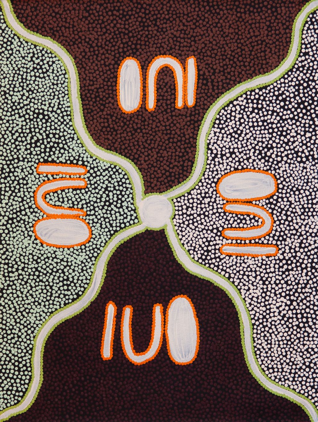 This work portrays an area of Country that can be interpreted in multiple ways. Firstly, the image may be read as an aerial representation of a particular location known to the artist- either land that they or their family travelled, from the pujiman (traditional, desert dwelling) era to now. During the pujiman period, Martu would traverse very large distances annually in small family groups, moving seasonally from water source to water source, and hunting and gathering bush tucker as they went. At this time, one’s survival depended on their intimate knowledge of the location of resources; thus physical elements of Country, such as sources of kapi (water), tali (sandhills), different varieties of warta (trees, vegetation), ngarrini (camps), and jina (tracks) are typically recorded with the use of a use of a system of iconographic forms universally shared across the desert.