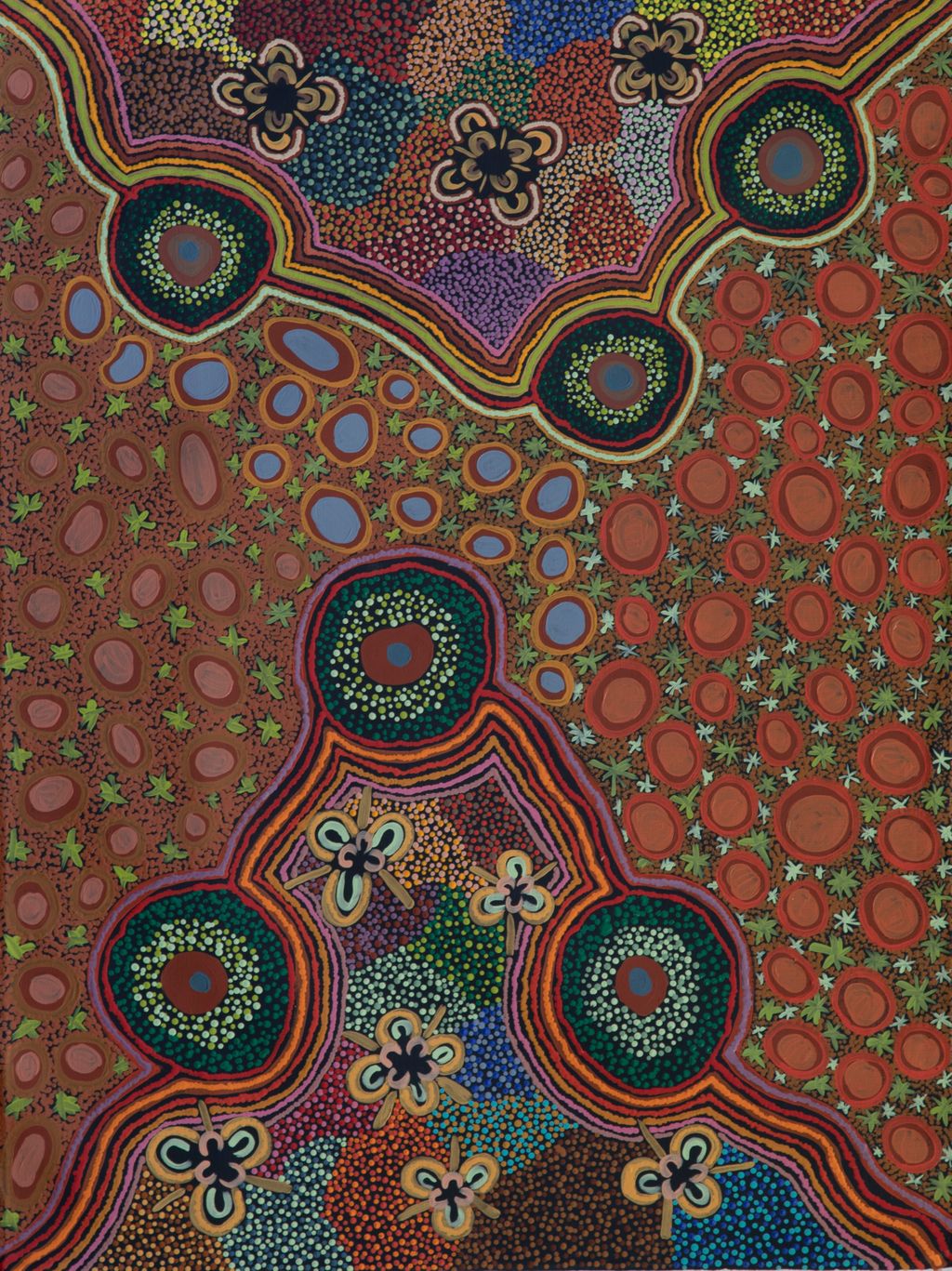 In this work Marlene depicts a waterhole and rock hole located in Mungili, the small outstation community located just off the Eagle Highway in Western Australia, approximately 430 kilometres northeast of Wiluna and 250 kilometres north of Warburton. Marlene grew up in Mungili, and as such it forms a significant part of her ‘ngurra’ (home Country, camp). Typically Marlene depicts this site with a central large circular form that represents the main waterhole, surrounded by smaller circular forms representing satellite water bodies.