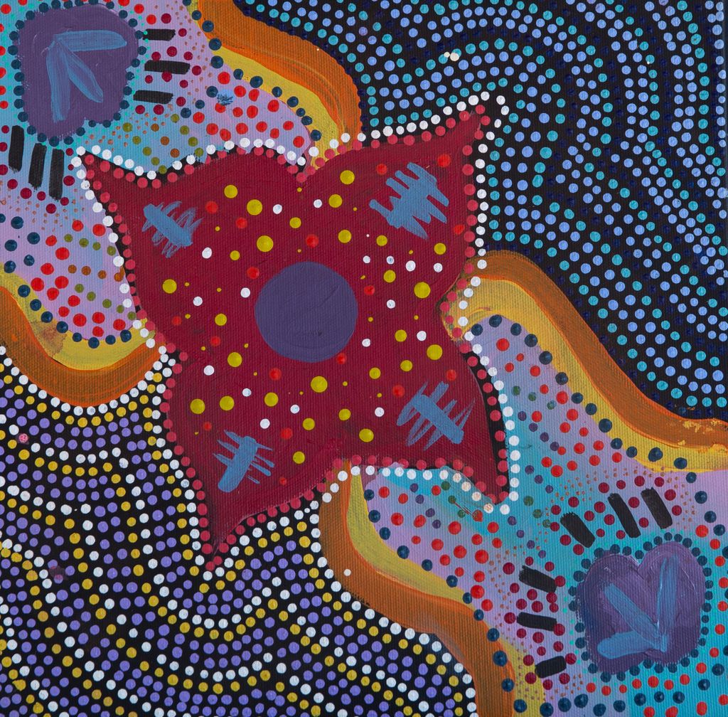Younger Martu artists often start painting alongside their parents, grandparents, and extended family, which fosters an organic learning process. This not only involves mastering painting techniques but also understanding specific locations, family histories, traditional ways of life, bush tucker, and Jukurrpa (Dreaming). Over time, with encouragement from their peers, they develop their own distinct styles and explore unique painting techniques and subject matter. In this work the artist brings a contemporary, evolving perspective to their work.