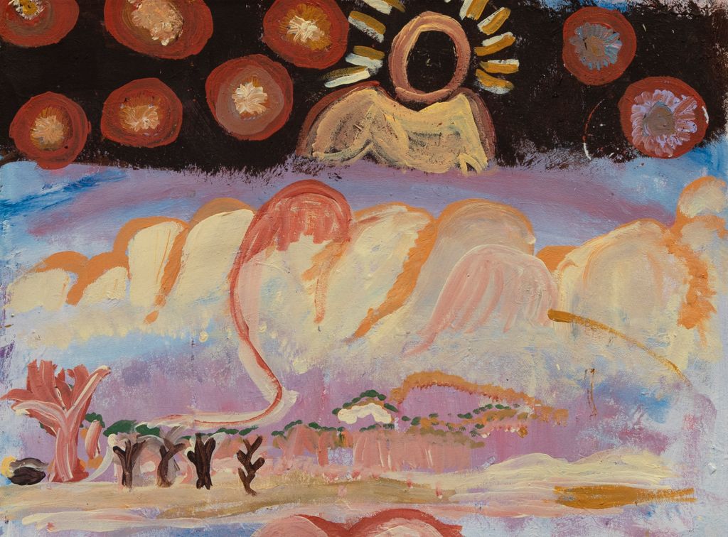 According to two of the central Martu Jukurrpa narratives, the Karlamilyi River and its surrounds were created by the ancestral beings Jila Kujarra (Two Snakes) and the Wati Kujarra (Two Goanna Men) as they travelled across the lands.