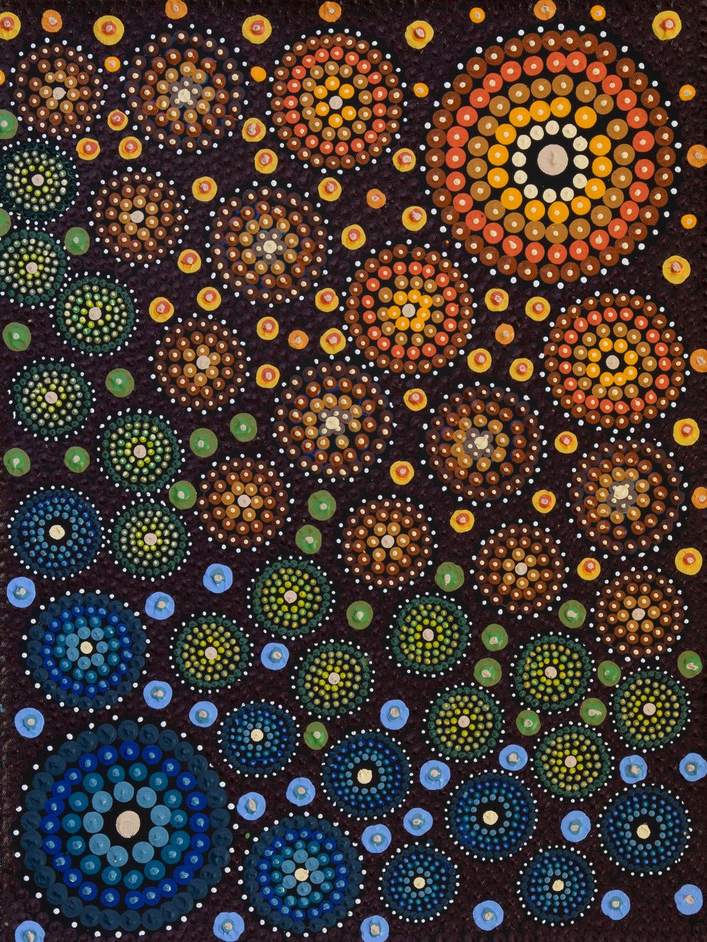 An additional layer of meaning in the work relates to more intangible concepts; life cycles based around kalyu (rain, water) and waru (fire) are also often evident. A thousands of year old practice, fire burning continues to be carried out as both an aid for hunting and a means of land management today. As the Martu travelled and hunted they would burn tracts of land, ensuring plant and animal biodiversity and reducing the risk of unmanageable, spontaneous bush fires. The patchwork nature of regrowth is evident in many landscape works, with each of the five distinctive phases of fire burning visually described with respect to the cycle of burning and regrowth.