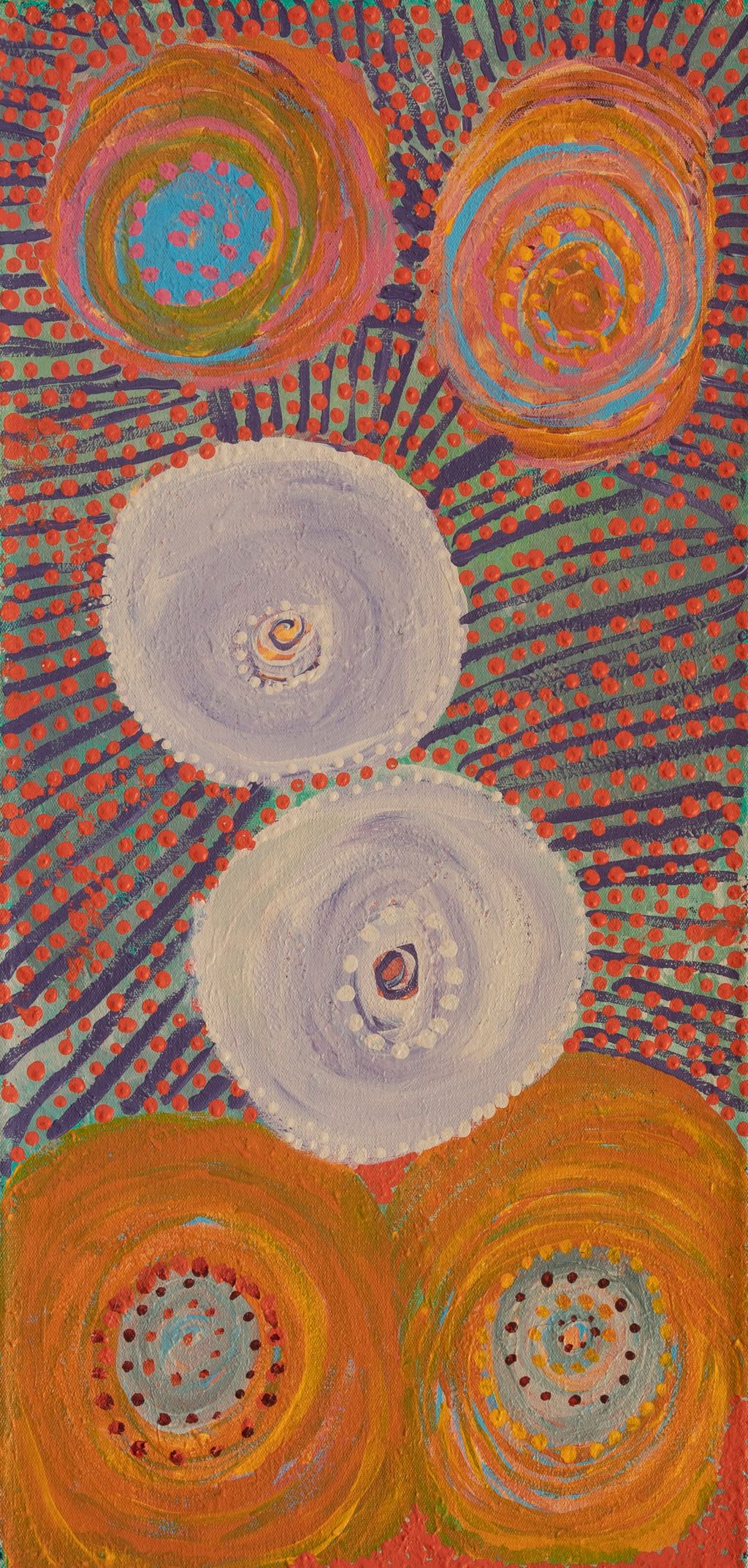 Portrayed in this work are features of Dale’s family’s ngurra, such as the striking salt lakes, dominant permanent red tali (sandhills), warta (trees, vegetation), and the individually named water sources they camped at. Rock holes, waterholes, soaks and springs were all extremely important sites for Martu people during the pujiman period, and are generally depicted with circular forms.