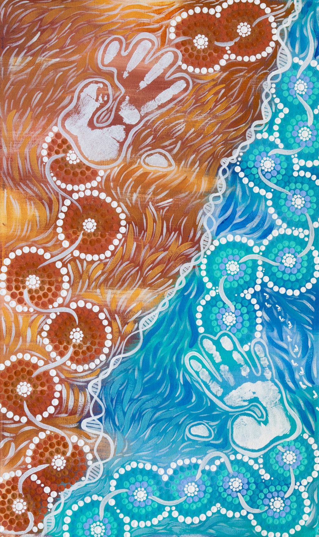 Younger Martu artists often start painting alongside their parents, grandparents, and extended family, which fosters an organic learning process. This not only involves mastering painting techniques but also understanding specific locations, family histories, traditional ways of life, bush tucker, and Jukurrpa (Dreaming). Over time, with encouragement from their peers, they develop their own distinct styles and explore unique painting techniques and subject matter. In this work the artist brings a contemporary, evolving perspective to their work.