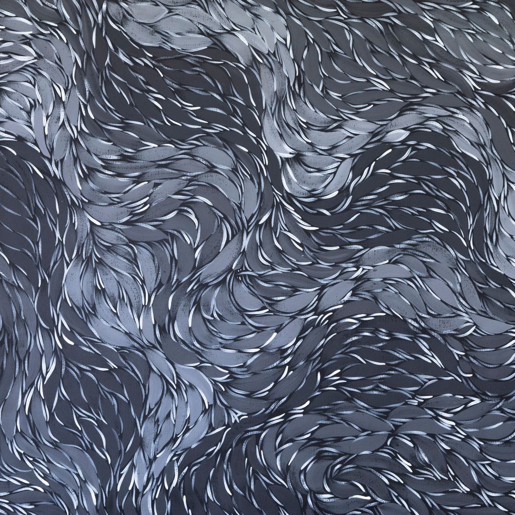 Younger Martu artists often start painting alongside their parents, grandparents, and extended family, which fosters an organic learning process. This not only involves mastering painting techniques but also understanding specific locations, family histories, traditional ways of life, bush tucker, and Jukurrpa (Dreaming). Over time, with encouragement from their peers, they develop their own distinct styles and explore unique painting techniques and subject matter. In this work the artist brings a contemporary, evolving perspective to their work.