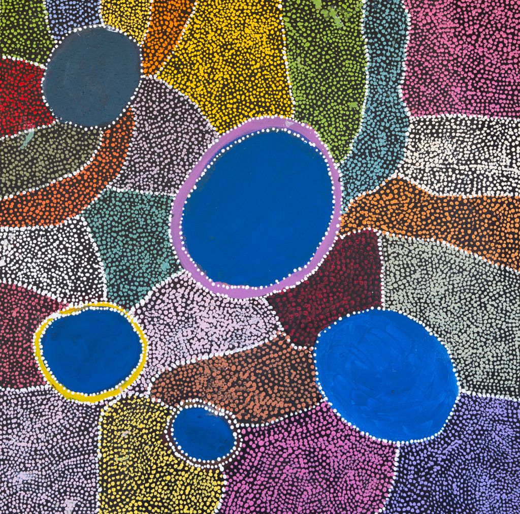 Wirlarra, the site depicted in this painting, lies on the eastern edge of a large salt lake, Nyayartakujarra (Lake Dora), near Punmu Aboriginal community. A distinctive group of small salt water pools are clustered together here. The water from these pools is known for its’ powerful healing properties, and the pools are still visited today by Martu to bathe cuts and sores.