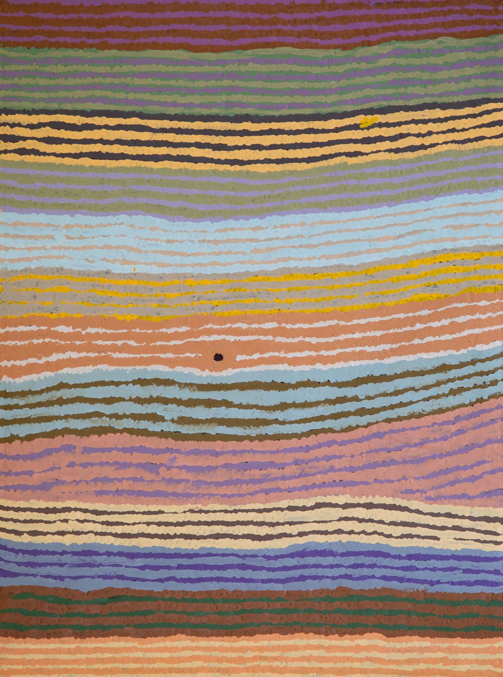This work depicts a waterhole in the area around Moolyella, an area close to Marble Bar that was mined for tin from 1898. Industrial production ceased by 1921, and from the late 1920’s several Aboriginals families, including Lorna’s, began working the mine. Tin and other minerals were retrieved from claypans and dry river beds using a yandy (dish used for winnowing seed).