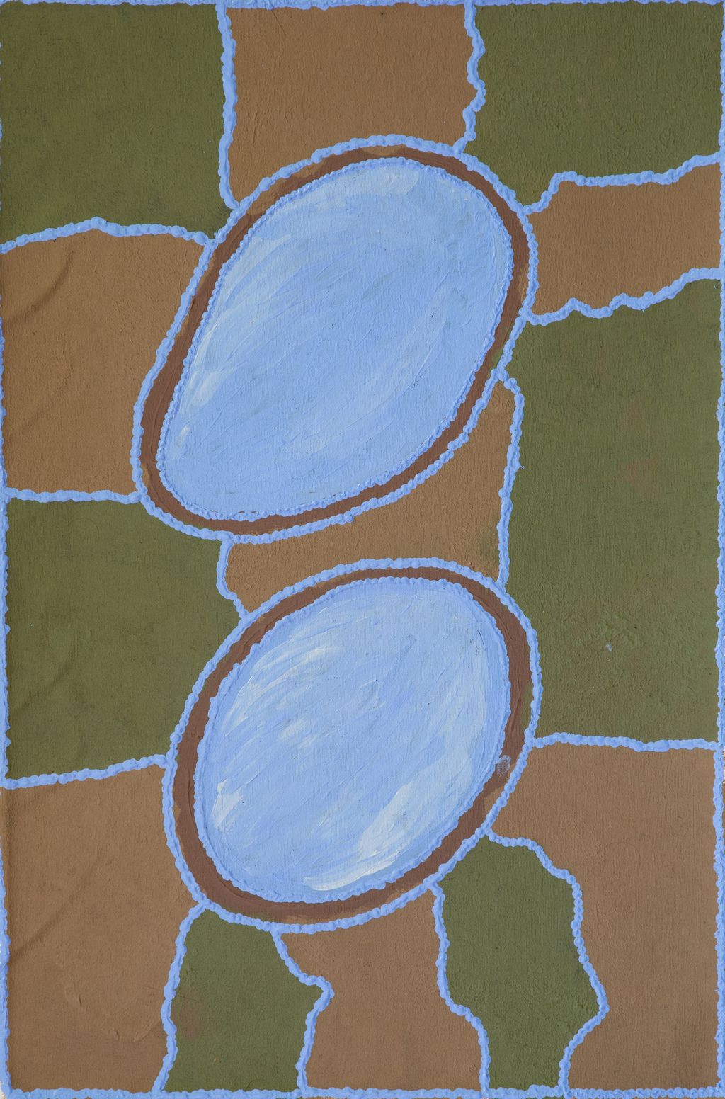 This work portrays an area of Country that can be interpreted in multiple ways. Firstly, the image may be read as an aerial representation of a particular location known to the artist- either land that they or their family travelled, from the pujiman (traditional, desert dwelling) era to now. During the pujiman period, Martu would traverse very large distances annually in small family groups, moving seasonally from water source to water source, and hunting and gathering bush tucker as they went. At this time, one’s survival depended on their intimate knowledge of the location of resources; thus physical elements of Country, such as sources of kapi (water), tali (sandhills), different varieties of warta (trees, vegetation), ngarrini (camps), and jina (tracks) are typically recorded with the use of a use of a system of iconographic forms universally shared across the desert.