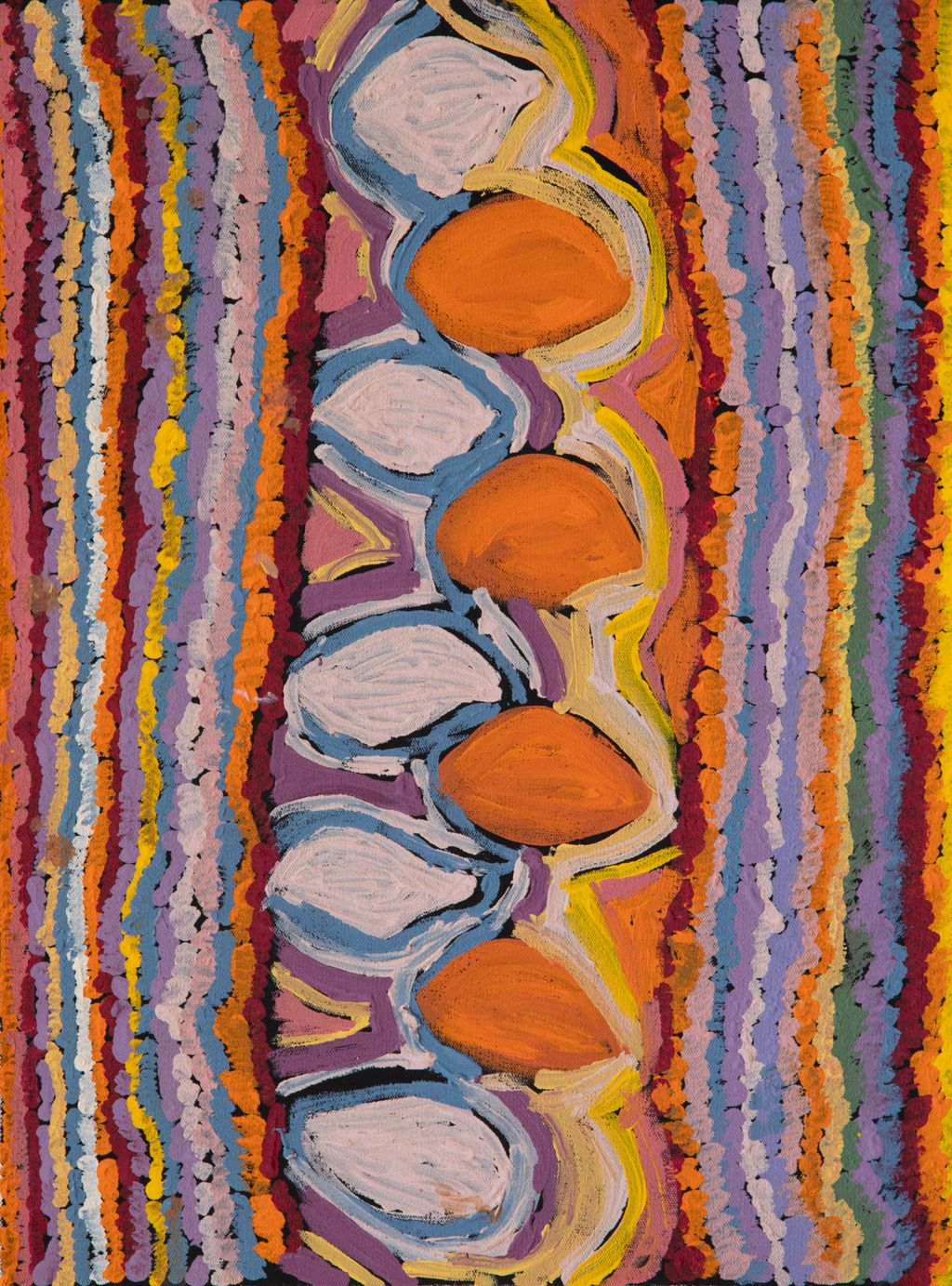 Depicted in this work are a combination of desert flowers and traditional types of mayi (plant food).