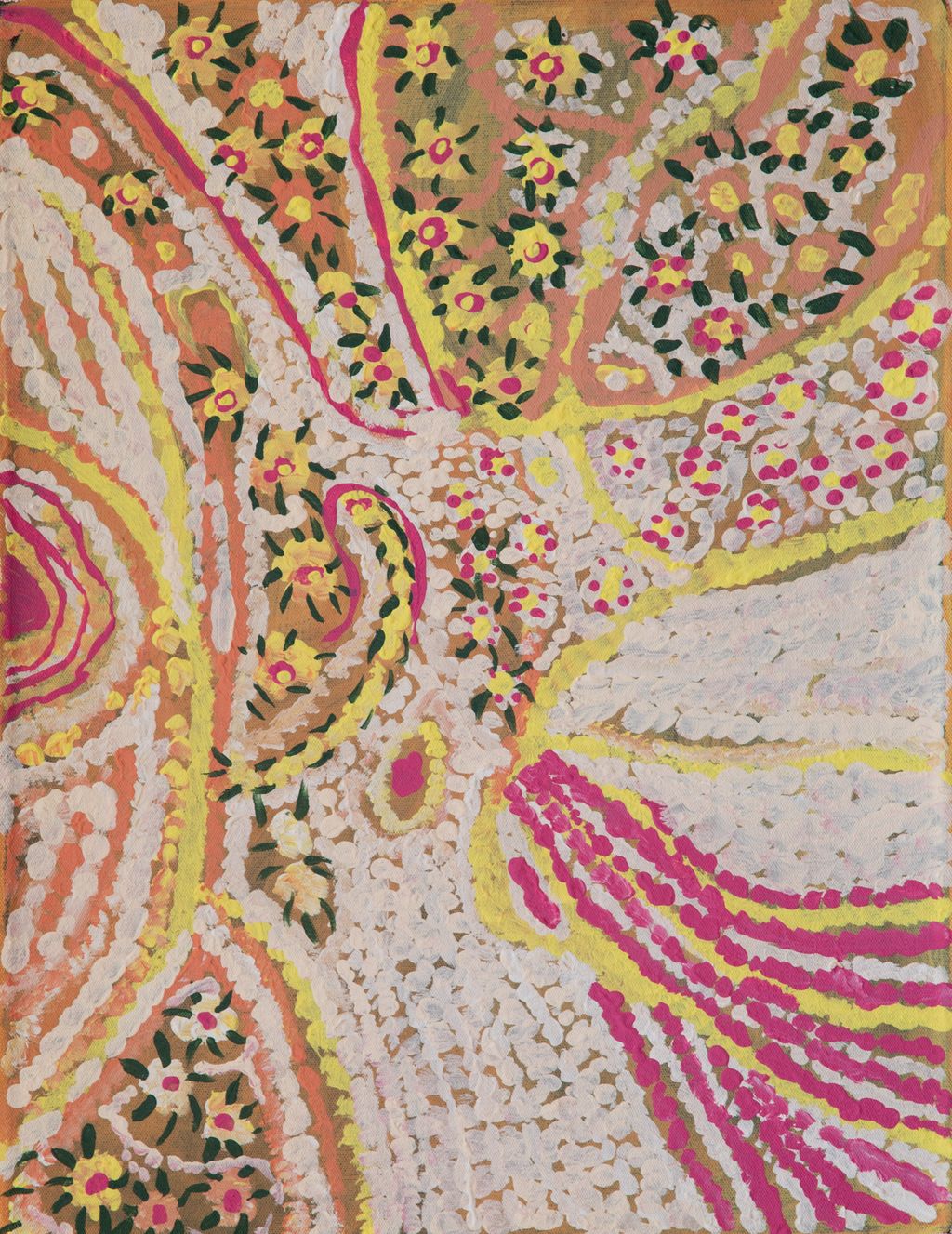 This work depicts a waterhole in the area around Moolyella, an area close to Marble Bar that was mined for tin from 1898. Industrial production ceased by 1921, and from the late 1920’s several Aboriginals families, including Lorna’s, began working the mine. Tin and other minerals were retrieved from claypans and dry river beds using a yandy (dish used for winnowing seed).