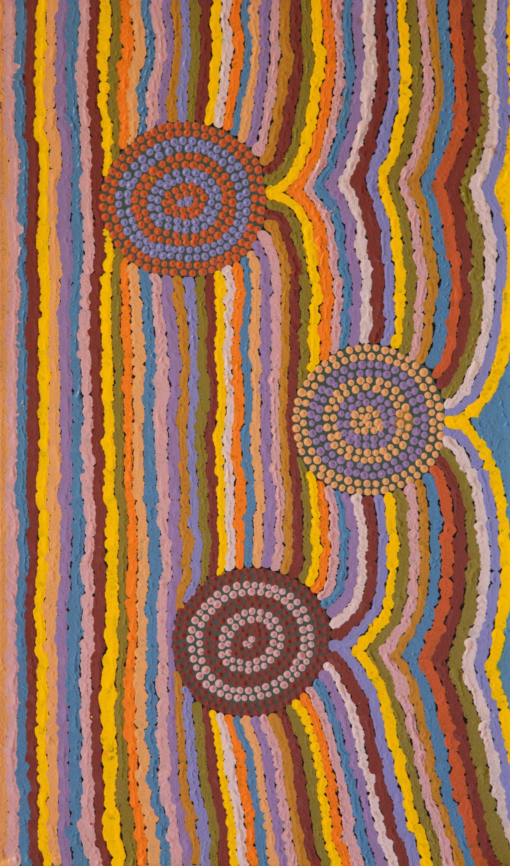 Depicted in this work are tali and sources of kapi (water) within the artists’ ngurra (home Country, camp). Today Martu Country is still defined in terms of the location and type of water. Each of the hundreds of claypans, rockholes, waterholes, soaks and springs found in the Martu desert homelands is known through real life experience and the recounting of Jukurrpa (Dreaming) narratives by name, location, quality and seasonal availability. For thousands of years, Aboriginal people have typically represented water with circular forms, and tali with linear groupings in rock art, sand drawings, and now contemporary paintings.