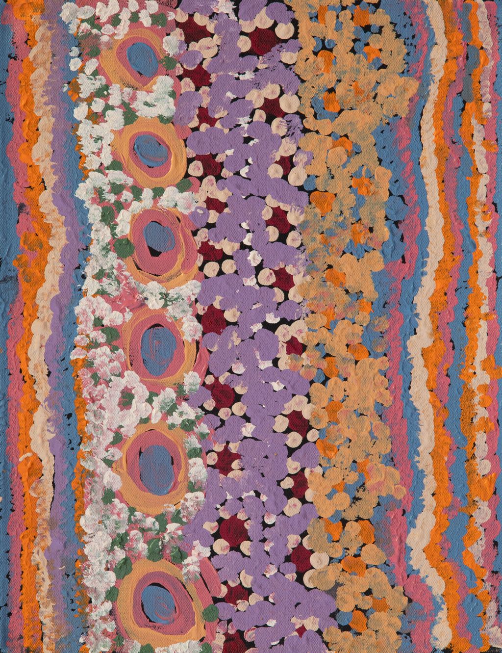 Mary, through her work, acknowledges the intrinsic value of the remarkably diverse flora found through Martu Country. These plants are not only vital as significant food sources, but also celebrated for their aesthetic splendour. In the context of the often harsh and arid environments in which desert flowers bloom, their vibrancy, delicacy, and variation become even more spectacular.