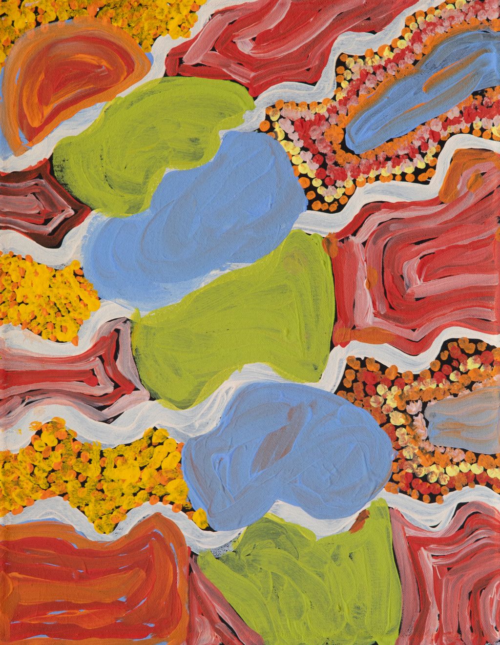 This work portrays an area of Country that can be interpreted in multiple ways. Firstly, the image may be read as an aerial representation of a particular location known to the artist- either land that they or their family travelled, from the pujiman (traditional, desert dwelling) era to now. During the pujiman period, Martu would traverse very large distances annually in small family groups, moving seasonally from water source to water source, and hunting and gathering bush tucker as they went. At this time, one’s survival depended on their intimate knowledge of the location of resources; thus physical elements of Country, such as sources of kapi (water), tali (sandhills), different varieties of warta (trees, vegetation), ngarrini (camps), and jina (tracks) are typically recorded with the use of a use of a system of iconographic forms universally shared across the desert.