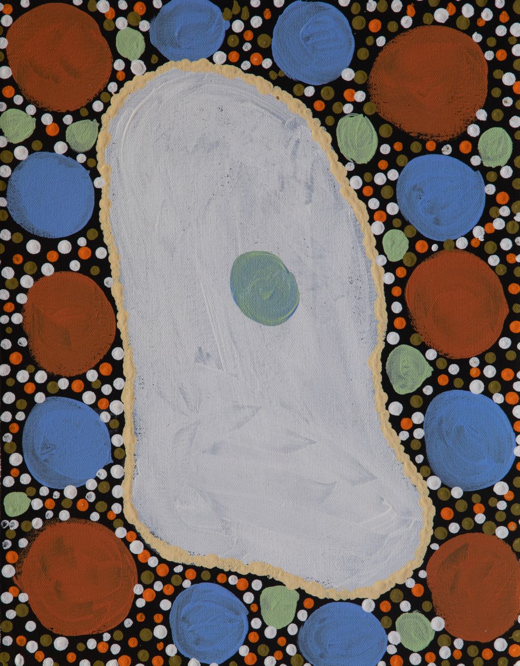 This work portrays an area of Country that can be interpreted in multiple ways. Firstly, the image may be read as an aerial representation of a particular location known to the artist- either land that they or their family travelled, from the pujiman (traditional, desert dwelling) era to now. During the pujiman period, Martu would traverse very large distances annually in small family groups, moving seasonally from water source to water source, and hunting and gathering bush tucker as they went. At this time, one’s survival depended on their intimate knowledge of the location of resources; thus physical elements of Country, such as sources of kapi (water), tali (sandhills), different varieties of warta (trees, vegetation), ngarrini (camps), and jina (tracks) are typically recorded with the use of a use of a system of iconographic forms universally shared across the desert.