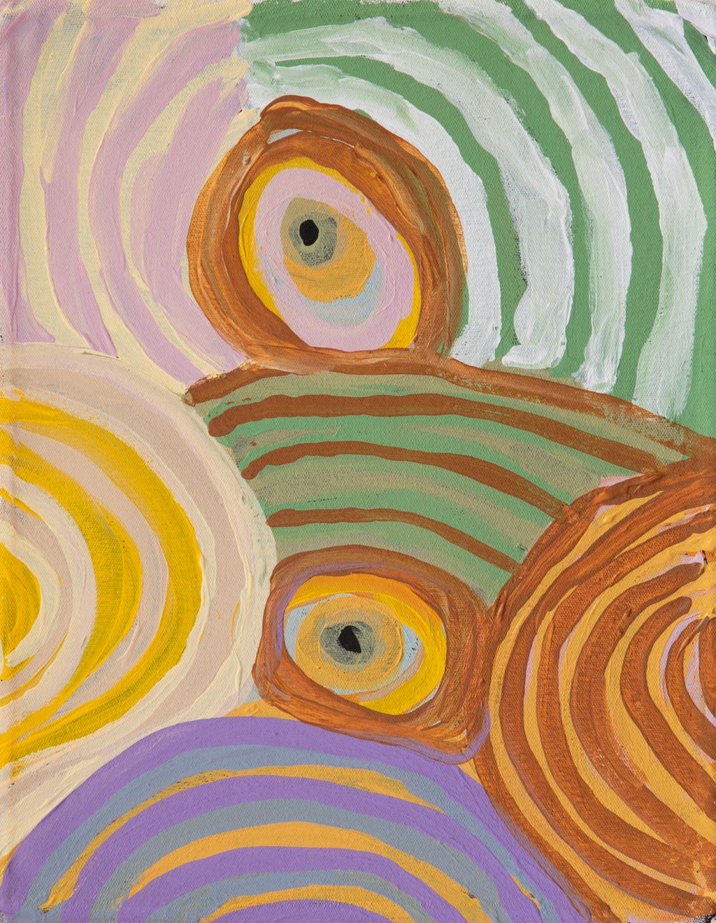 This painting is about every rockhole in Moolyella, where I used to work… We would walk and get some water from the rockholes and go away back home- get that water from these rockholes when we were working. My father and mother’s surname was Mulialla, they were named after that place.”