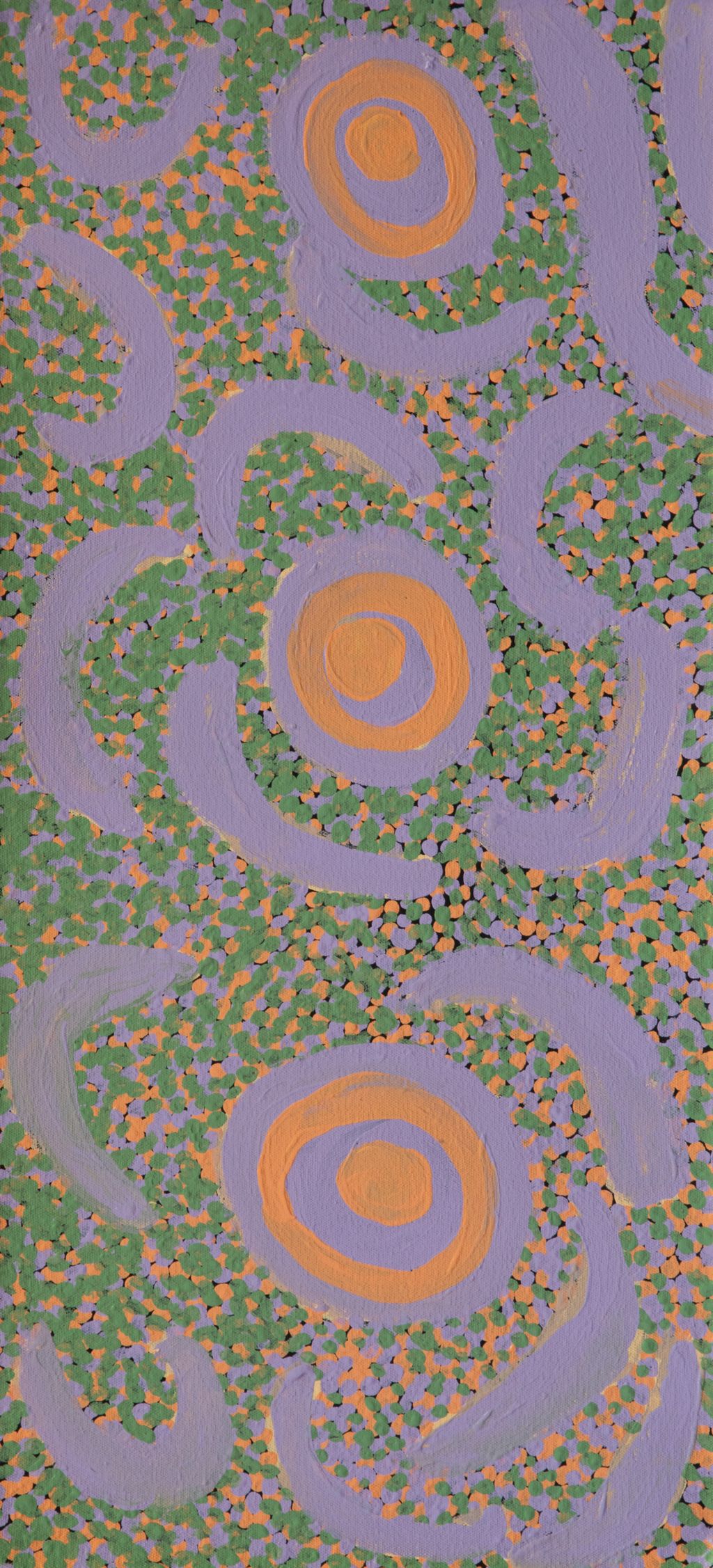 This painting is about every rockhole in Moolyella, where I used to work… We would walk and get some water from the rockholes and go away back home-  get that water from these rockholes when we were working. My father and mother’s surname was Mulialla, they were named after that place.”