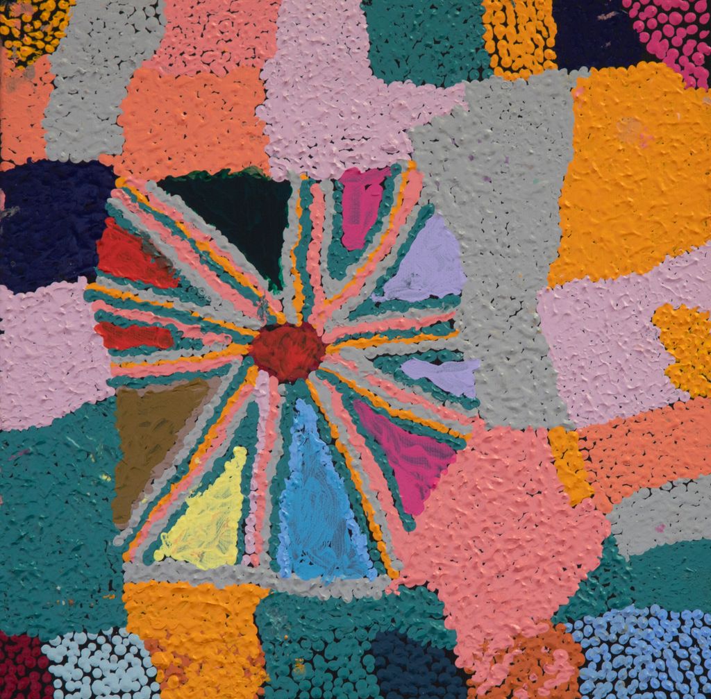 This work portrays an area of Country that can be interpreted in multiple ways. Firstly, the image may be read as an aerial representation of a particular location known to the artist- either land that they or their family travelled, from the pujiman (traditional, desert dwelling) era to now. During the pujiman period, Martu would traverse very large distances annually in small family groups, moving seasonally from water source to water source, and hunting and gathering bush tucker as they went. At this time, one’s survival depended on their intimate knowledge of the location of resources; thus physical elements of Country, such as sources of kapi (water), tali (sandhills), different varieties of warta (trees, vegetation), ngarrini (camps), and jina (tracks) are typically recorded with the use of a use of a system of iconographic forms universally shared across the desert.