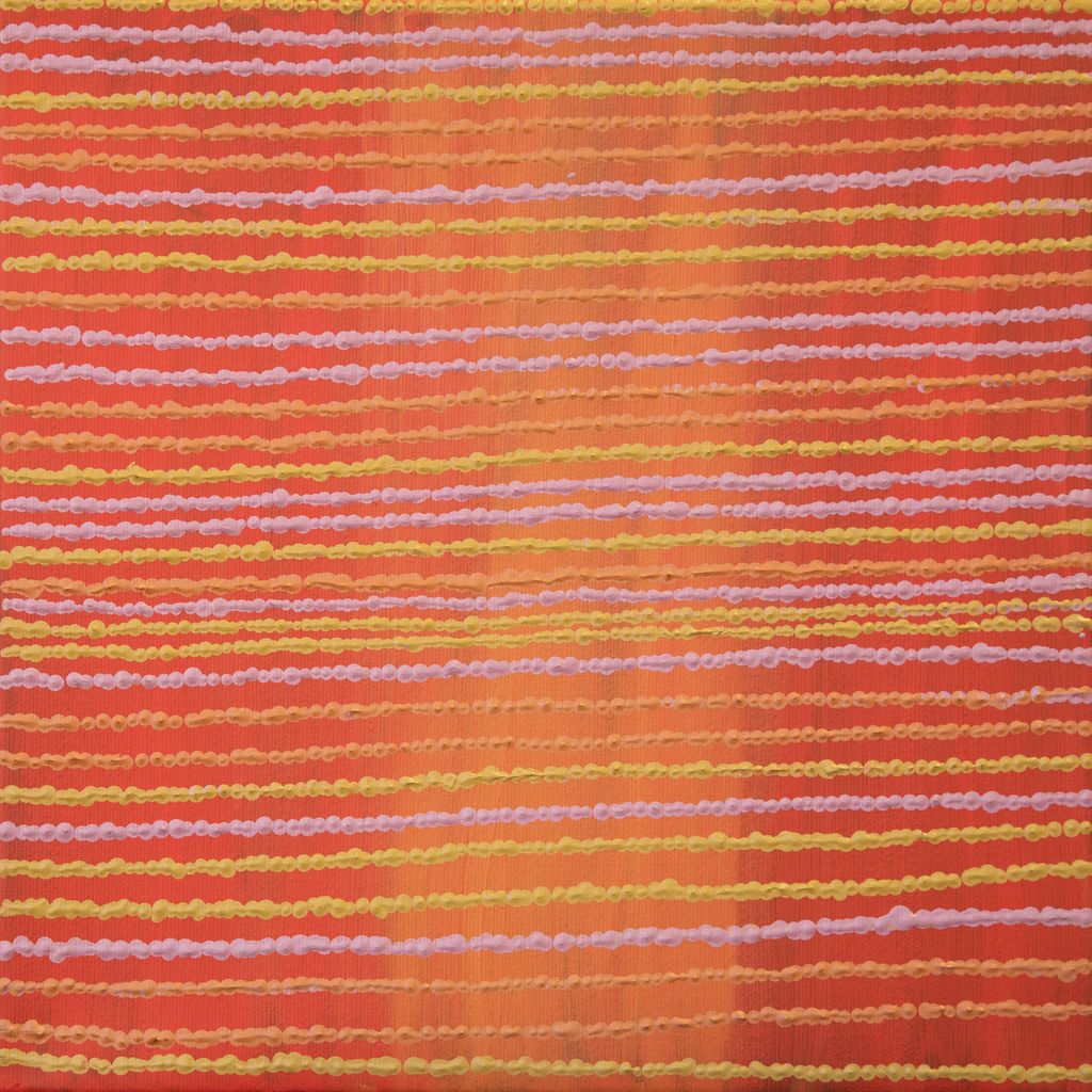 “The sand dunes play important roles in our Martu culture, especially in most parts of the desert regions. Tali (sandhills) are sometimes boundaries, travel pathways, and act as wind breaks in windy seasons for Martu. I have been guided by my elders, Muuki, Nola, and Wokka Taylor in what to paint and what not to paint. And as young adults we paint seasons, some rockholes and sand dunes, some animals too. This painting are the Tali, at Kulyakartu.”