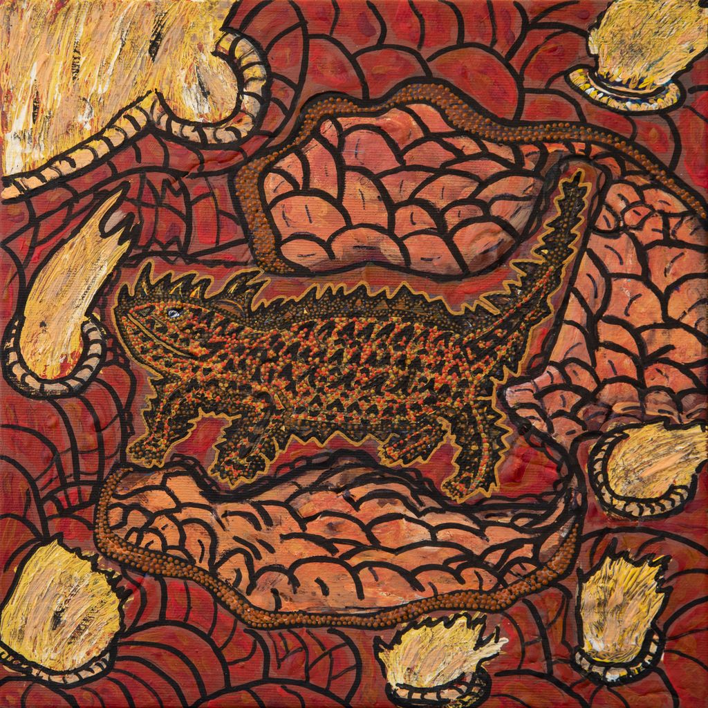 Younger Martu artists often start painting alongside their parents, grandparents, and extended family, which fosters an organic learning process. This not only involves mastering painting techniques but also understanding specific locations, family histories, traditional ways of life, bush tucker, and Jukurrpa (Dreaming). Over time, with encouragement from their peers, they develop their own distinct styles and explore unique painting techniques and subject matter. In this work the artist brings a contemporary, evolving perspective to their work.
