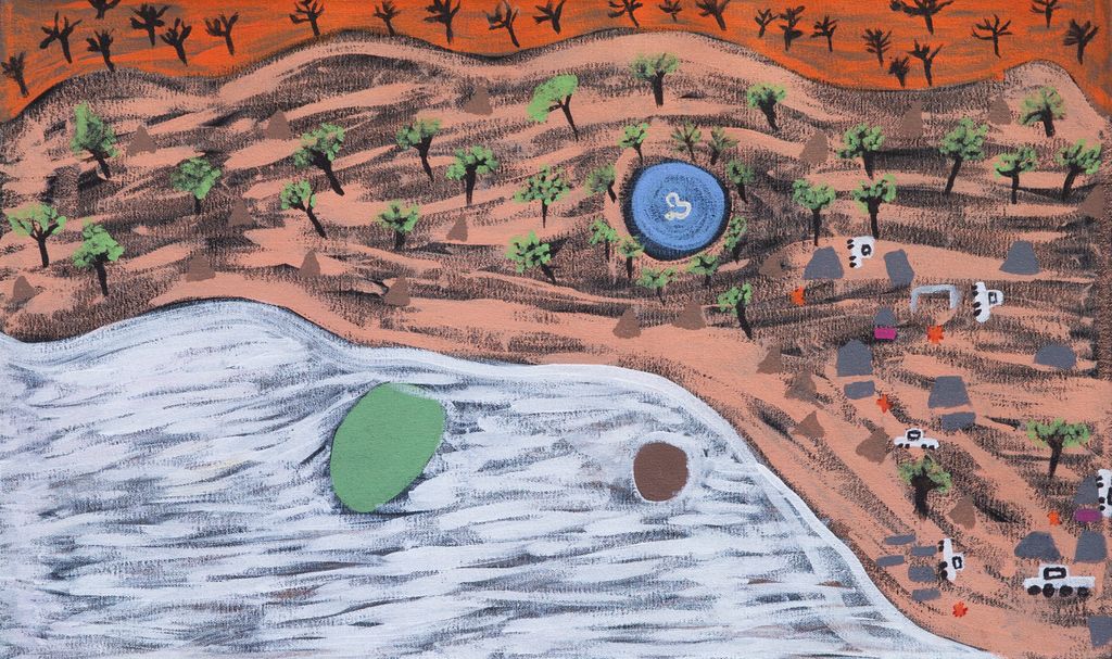 The soak at Wirnpa is named after one of the most powerful of the ancestral jila (snake) men and the last to travel the desert during the Jukurrpa (Dreaming). The Western Desert term jila is used interchangeably to describe springs considered to be ‘living’ waters and snakes, both of which play a central role in Martu culture and Jukurrpa. Wirnpa is a rainmaking jila who lived and hunted in the Percival Lakes area. His travels are described in the songs and stories of many language groups across the Western Desert, even those far removed from his home site. In his epic travels, Wirnpa met and feasted with many other ancestral beings, exchanged ceremonial objects, and created a series of different laws and ceremonies. When he finally returned home, he searched for his many children only to discover that they had already died. They had laid down and become the salt springs of the Percival Lakes. Wirnpa wept for his children before himself transforming into a snake and entering the soak where he still resides.