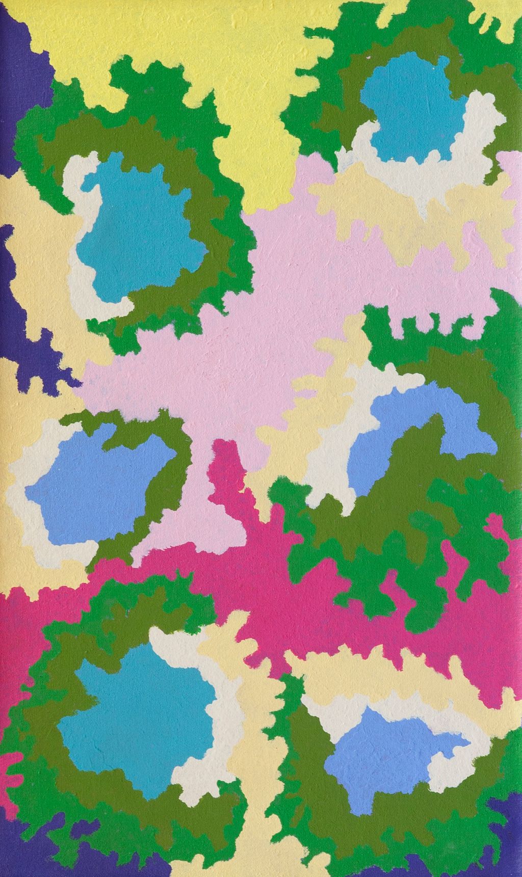 An additional layer of meaning in the work relates to more intangible concepts; life cycles based around kalyu (rain, water) and waru (fire) are also often evident. A thousands of year old practice, fire burning continues to be carried out as both an aid for hunting and a means of land management today. As the Martu travelled and hunted they would burn tracts of land, ensuring plant and animal biodiversity and reducing the risk of unmanageable, spontaneous bush fires. The patchwork nature of regrowth is evident in many landscape works, with each of the five distinctive phases of fire burning visually described with respect to the cycle of burning and regrowth.