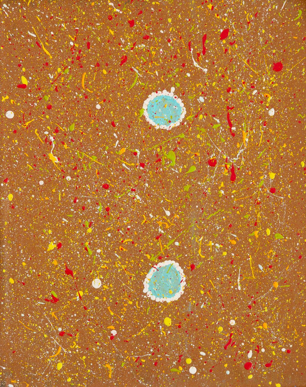 Younger Martu artists often start painting alongside their parents, grandparents, and extended family, which fosters an organic learning process. This not only involves mastering painting techniques but also understanding specific locations, family histories, traditional ways of life, bush tucker, and Jukurrpa (Dreaming). Over time, with encouragement from their peers, they develop their own distinct styles and explore unique painting techniques and subject matter. In this work the artist brings a contemporary, evolving perspective to their work.