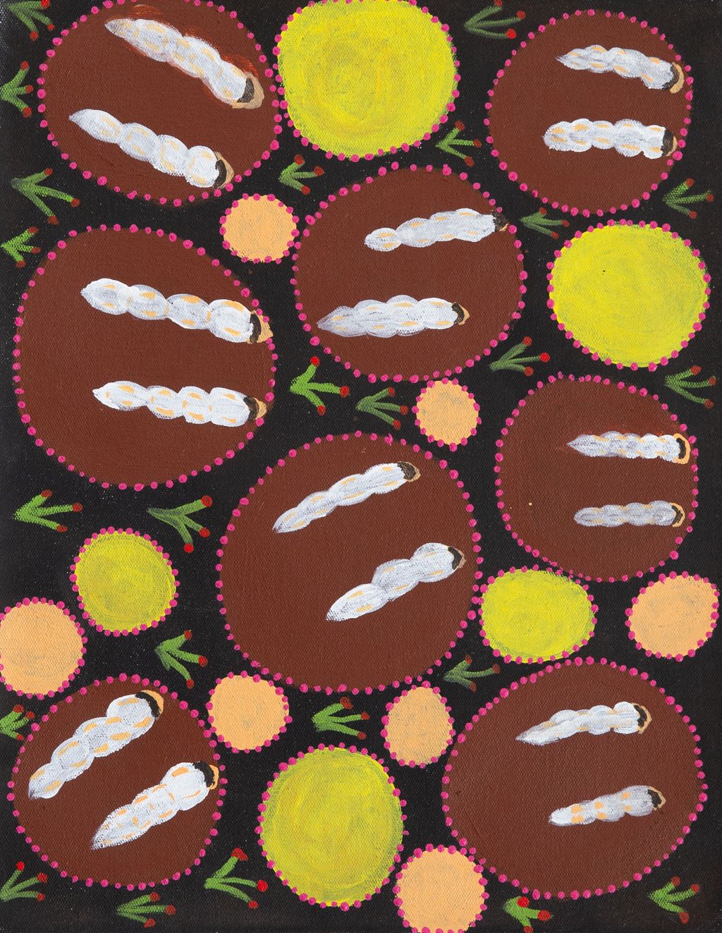 Lunki (witchetty grubs) are the large, pinkish white, wood eating larvae of several moth species. During the pujiman (traditional, desert dwelling) era, lunki were a reliable food source, forming a staple of the Martu diet, and today they remain equally popular. Lunki are eaten either raw or cooked in hot ashes, with a raw nutty taste that becomes creamy when cooked. Though they are available through the year, lunki are particularly prevalent in late wantajarra (cool season). They are found in the trunks and roots of several tree species including acacia, tinjirla (coolabah), and yurungkura (red river gum).