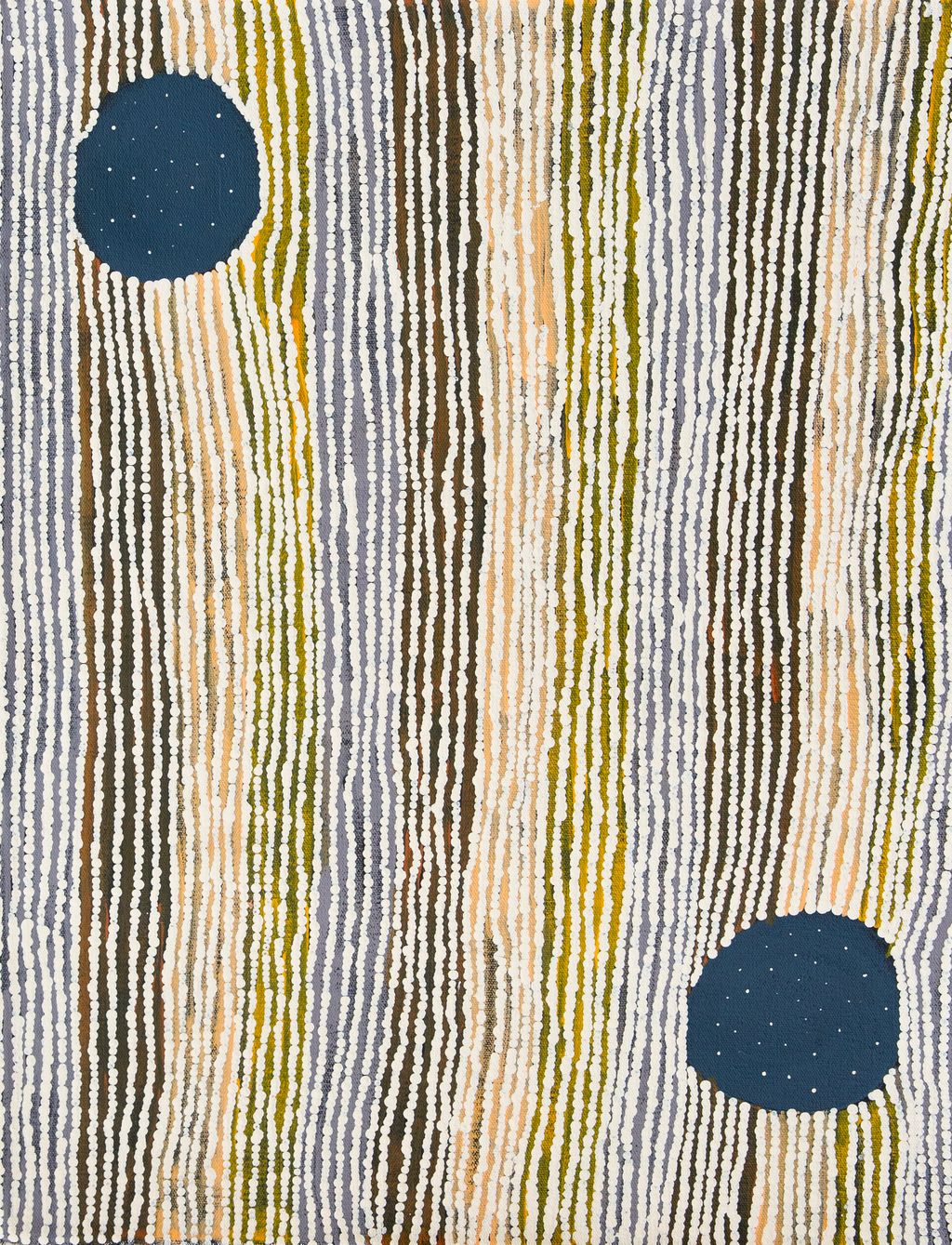 Younger Martu artists often start painting alongside their parents, grandparents, and extended family, which fosters an organic learning process. This not only involves mastering painting techniques but also understanding specific locations, family histories, traditional ways of life, bush tucker, and Jukurrpa (Dreaming). Over time, with encouragement from their peers, they develop their own distinct styles and explore unique painting techniques and subject matter. In this work the artist brings a contemporary, evolving perspective to their work.