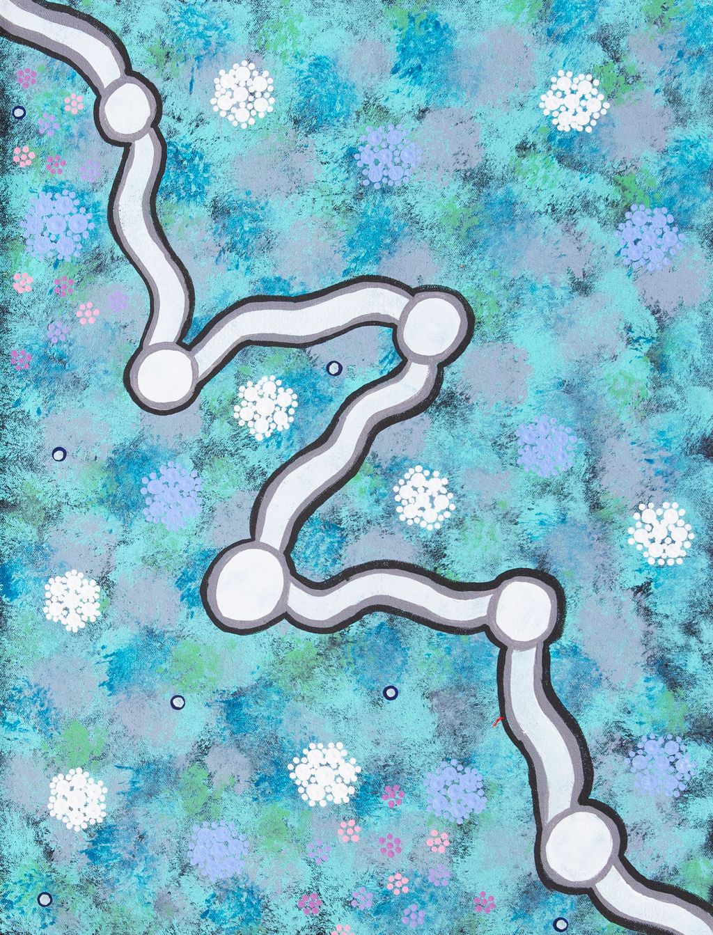 Younger Martu artists often start painting alongside their parents, grandparents, and extended family, which fosters an organic learning process. This not only involves mastering painting techniques but also understanding specific locations, family histories, traditional ways of life, bush tucker, and Jukurrpa (Dreaming). Over time, with encouragement from their peers, they develop their own distinct styles and explore unique painting techniques and subject matter. In this work the artist brings a contemporary, evolving perspective to their work.