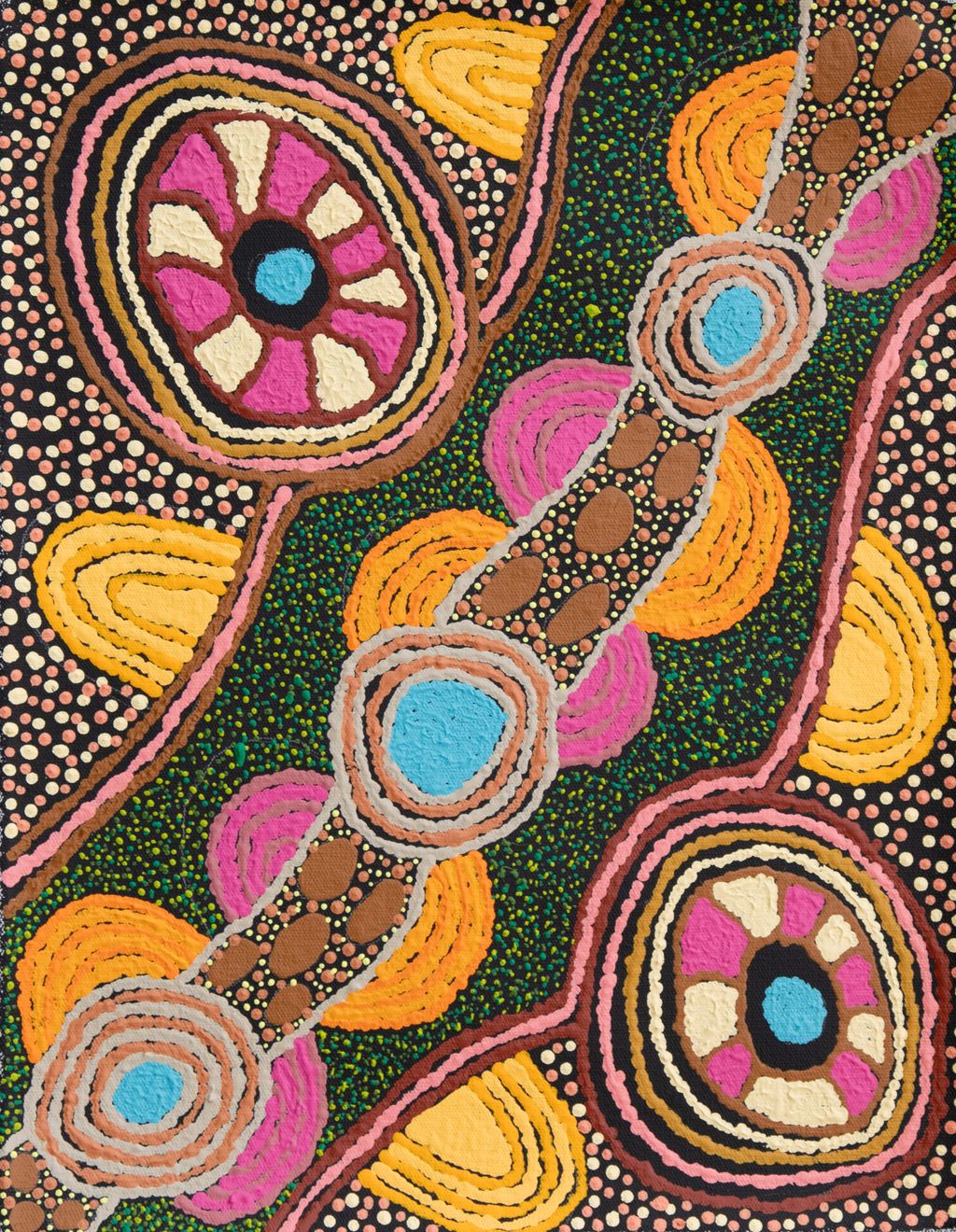 In this work Marlene depicts a waterhole and rock hole located in Mungili, the small outstation community located just off the Eagle Highway in Western Australia, approximately 430 kilometres northeast of Wiluna and 250 kilometres north of Warburton. Marlene grew up in Mungili, and as such it forms a significant part of her ‘ngurra’ (home Country, camp). Typically Marlene depicts this site with a central large circular form that represents the main waterhole, surrounded by smaller circular forms representing satellite water bodies.