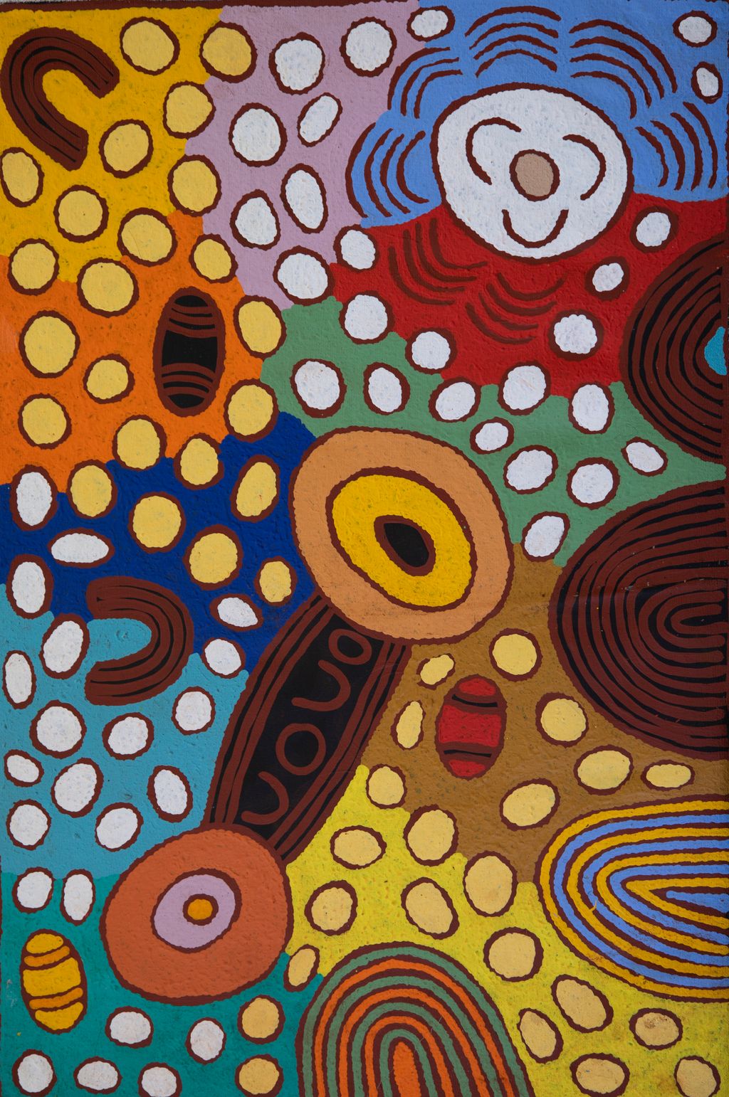 Younger Martu artists often start painting alongside their parents, grandparents, and extended family, which fosters an organic learning process. This not only involves mastering painting techniques but also understanding specific locations, family histories, traditional ways of life, bush tucker, and Jukurrpa (Dreaming). Over time, with encouragement from their peers, they develop their own distinct styles and explore unique painting techniques and subject matter. In this work the artist brings a contemporary, evolving perspective to their work.