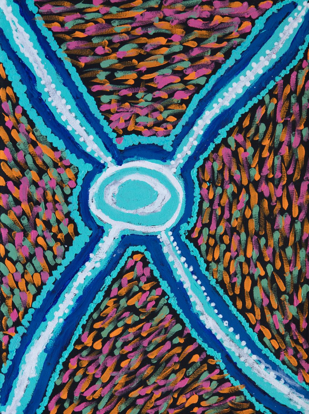 Younger Martu artists often start painting alongside their parents, grandparents, and extended family, which fosters an organic learning process. This not only involves mastering painting techniques but also understanding specific locations, family histories, traditional ways of life, bush tucker, and Jukurrpa (Dreaming). Over time, with encouragement from their peers, they develop their own distinct styles and explore unique painting techniques and subject matter. In this work the artist brings a contemporary, evolving perspective to their work.
