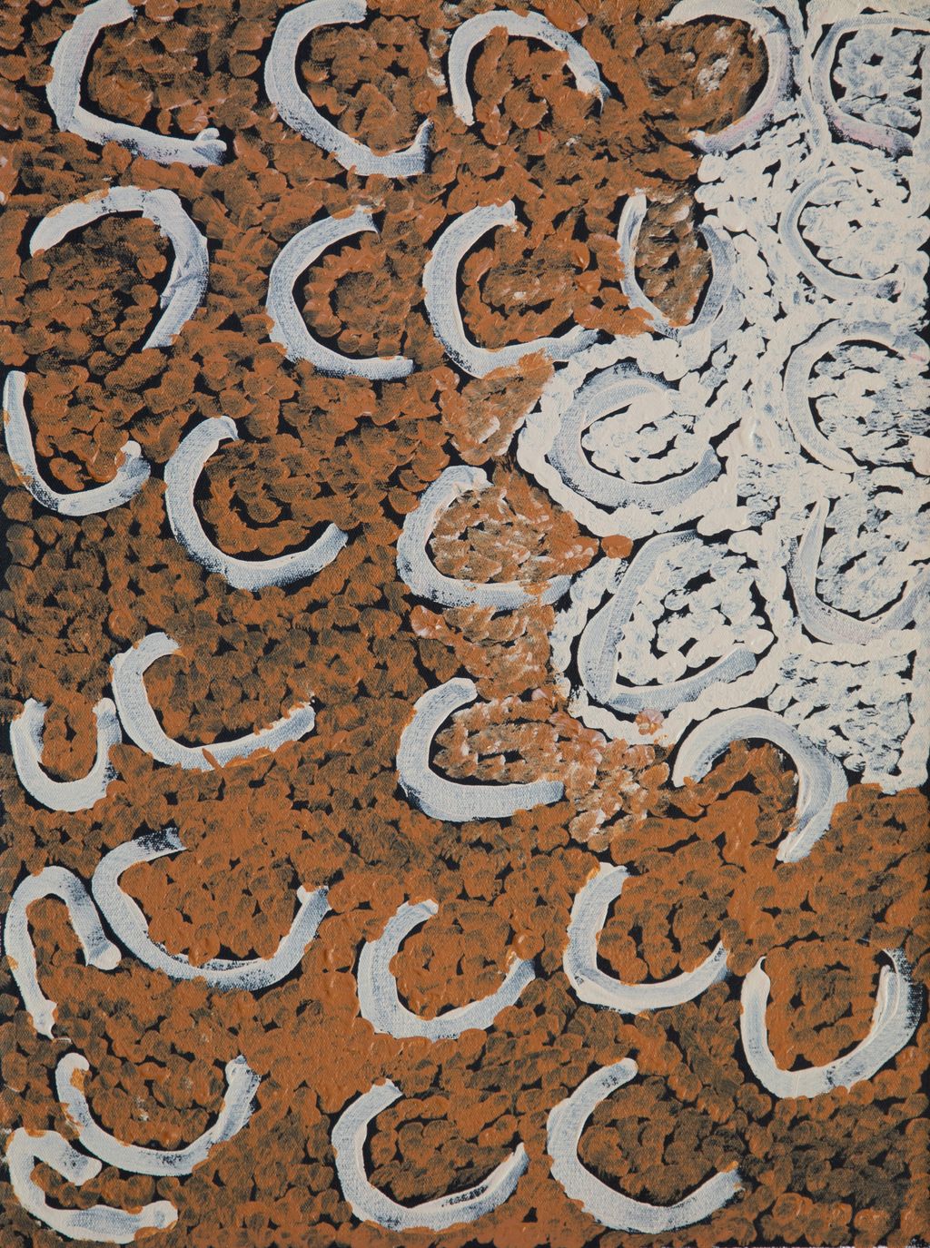 Portrayed in this work are features of Mayiwalku’s ngurra, such as the dominant permanent red tali (sandhills), warta (trees, vegetation), and the individually named water sources she and her family camped at. These include Januwa, Jilankujarra, Karlajarntu, Kartungu, Kularti, Kumpupajanu, Kunalimpi, Kunarra, Marnakarti, Pangkapirni, Wilunganinya, Wurur-wururna, Yilyara, and Yirrajarra Rock holes, waterholes, soaks and springs were all extremely important sites for Martu people during the pujiman period, and are generally depicted with circular forms.